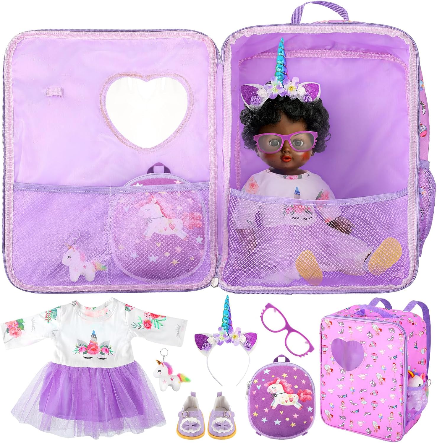 | Included Components | Doll travel bag, skirt, headdress, shoes, sunglasses, backpack, Unicorn |