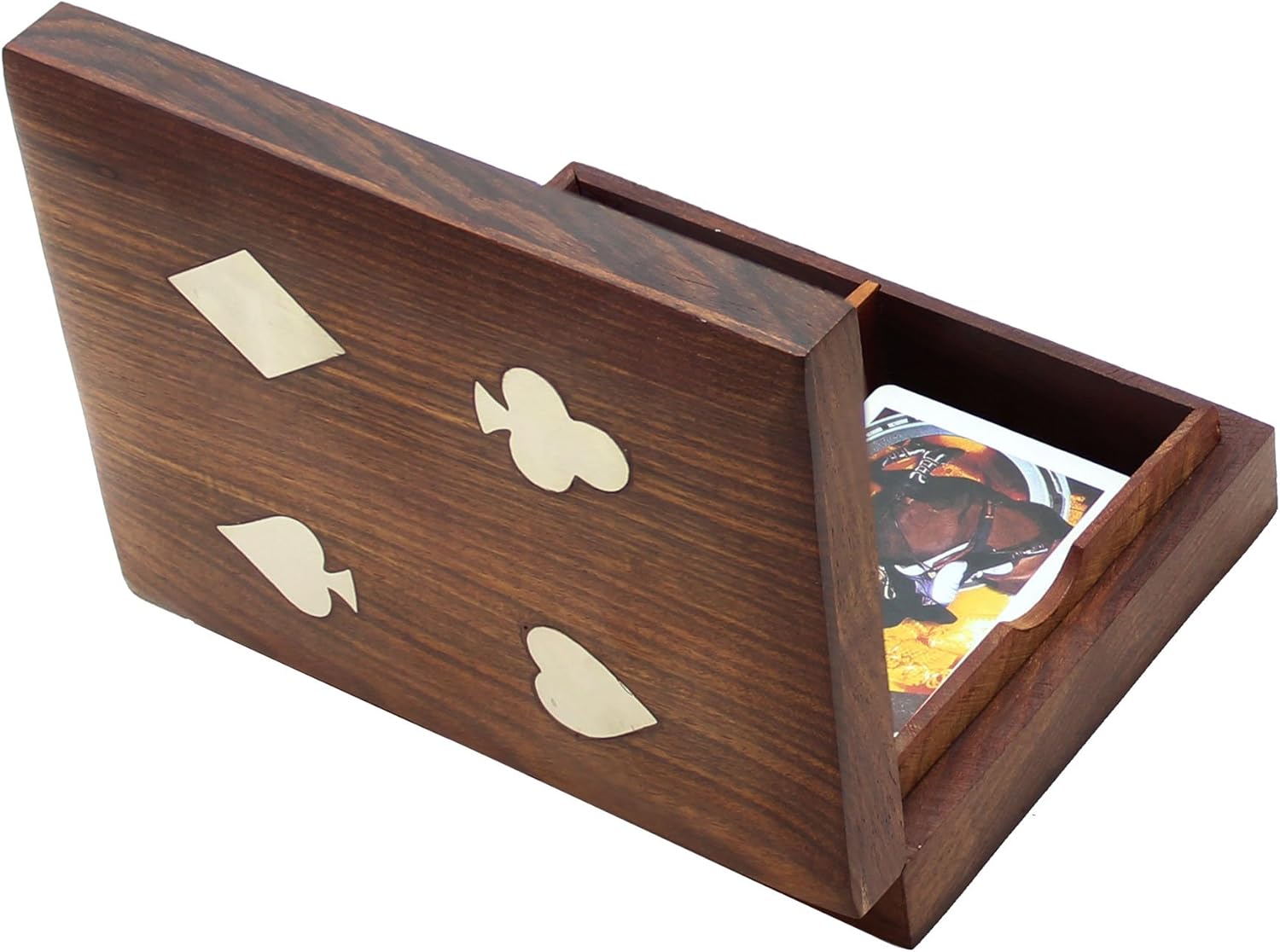 An elegant looking box to keep your playing cards deck. The box is handcrafted in pure seeshum wood, also called sesum in India. The White Metal inlay on the top adds to the beauty of the box. Playing cards are of high quality plastic.You would be proud to open this box and take out the cards while playing with your friends.
