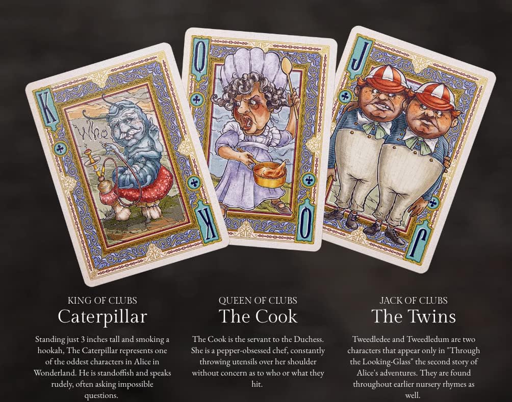 Take a trip down the Rabbit Hole in the Wonderland with Alice and the wildly unusual and whimsical characters of the beloved story, 'Alice in Wonderland'. Each card is meticulously designed in exquisite detail. With intricate borders and colours throughout the deck. The standard edition of the Alice deck features Gold accents on the back design as well as the tuck case. This detail makes distinguishing the standard from the Limited and gilded decks even easier. The jokers consist of a vertical diptych image of Alice (modelled after Jackson's daughter Scarlett), as she tumbles down the rabbit hole to find what awaits her in Wonderland. The deck comes wrapped in a gold-foiled, 3D-embossed tuck case that embodies the same intricacy of the card designs. Printed by the US Playing Card Company, this deck will quickly become a favourite in your collection!