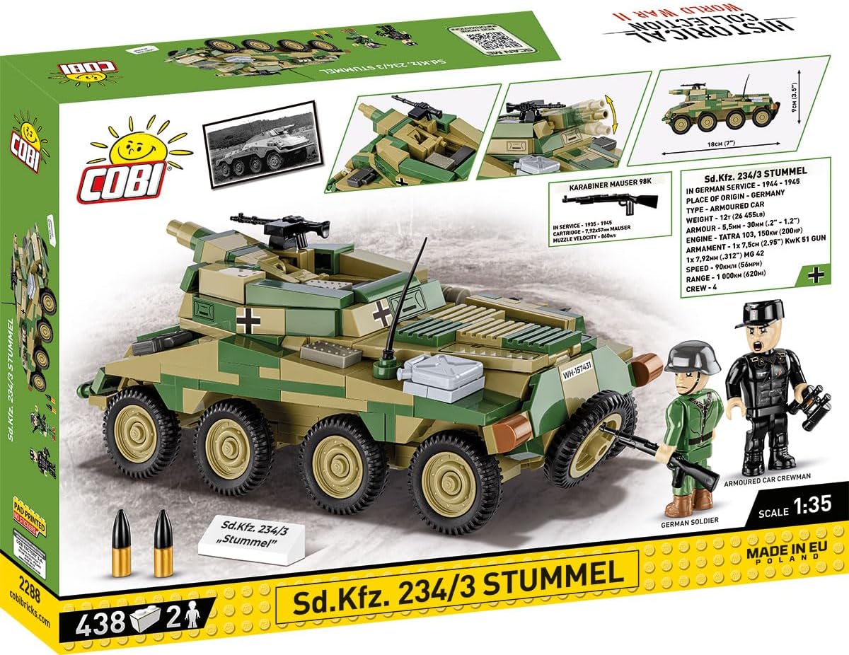 We designed the block model of the German heavy armored car Sd.Kfz 234/3 STUMMEL in a scale of 1:35 using 438 elements. Once built, the Stummel is 18cm long and its size fits both the figures and other vehicles we design in this scale. The COBI STUMMEL impresses with its precise design, camouflage and prints, which make it a very important addition to the Historical Collection. There are no stickers here, we only use permanent prints. The vehicle has moving elements such as wheels and a cannon. The set includes two figures depicting an armored car crew member and a German soldier with prints on the back. The entire set is complemented by a plate with the vehicle's name. The set is a must-have not only for young history enthusiasts, but above all for adult collectors and fans of military technology. Build history, piece by piece, with COBI. The Sd. Kfz. 234/3 Stummel was a German armored wheeled vehicle used during World War II. It was equipped with a 75mm cannon with a reserve of 50 rounds, which made it effective against other armored vehicles and lightly armored targets. The Stummel had a Tatra 103 diesel engine and a maximum speed of up to 90 km/h. Off-road, it performed almost as well as tracked vehicles. This infantry support vehicle was produced in a small quantity of approximately 88 units.