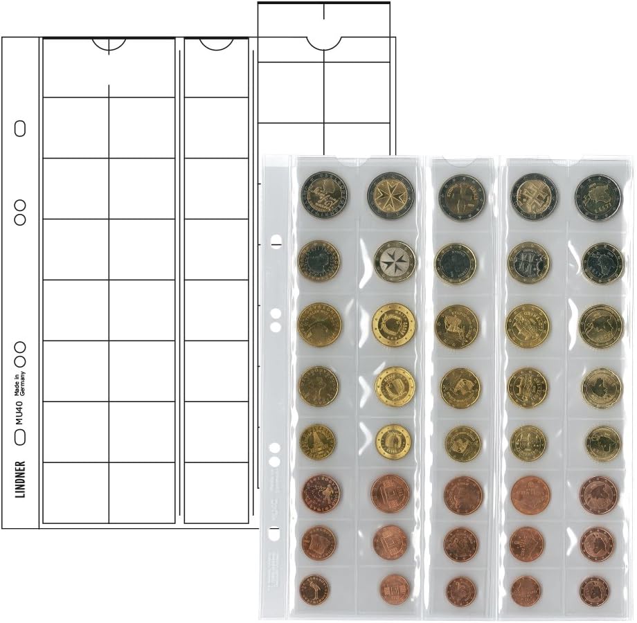 Has a vast capacity! Various page-varieties available! Padded ring binder made of padded synthetic foil with 4-ring mechanism.Because of the wide spine and the mechanism the album has a maximum capacity.The leatherette surface gives the ring binder an individual touch The spacious spine window allows space for identification of the contentens. Available with 10 crystal clear coin pages with transparent softner free strips in 5 divisions for over 3000 coins with differnt sizes. The high quality coin pages provide a neat and safe storage of your coin - collection.The characteristic Caliper device guarantees a practicle functionality.Whole series can be removed, added or changed.The coin pages are seperated by black card- interleaves. Format Ringbinder: 270x245x70 mm Formart Coin pages:252x202 mm Contens 2 x Coin pages for 15 coins each with a diameter of up to 42 mm (article-nr. MU !5) 2 x Coin pages for 24 coins each with a diameter of up to 34 mm (article nr.-MU24) 2 x Coin pages for 35 coins each with a diameter of 27 mm. Article nr. MU35) 2 x Coin pages for 54 coins each with a diameter of up to 20 mm (article nr. MU54) 2 x Coin pages each with 5 complete Euro-Coin sets (article nr.MU40) 2 x Cover pages 9 x black card.interleaves The coin pages can be ordered in pack of 5. Our Multi Collect System offers a vast selection of high quality crystal clear pages with a selection of pockets which caters for different types of collections.