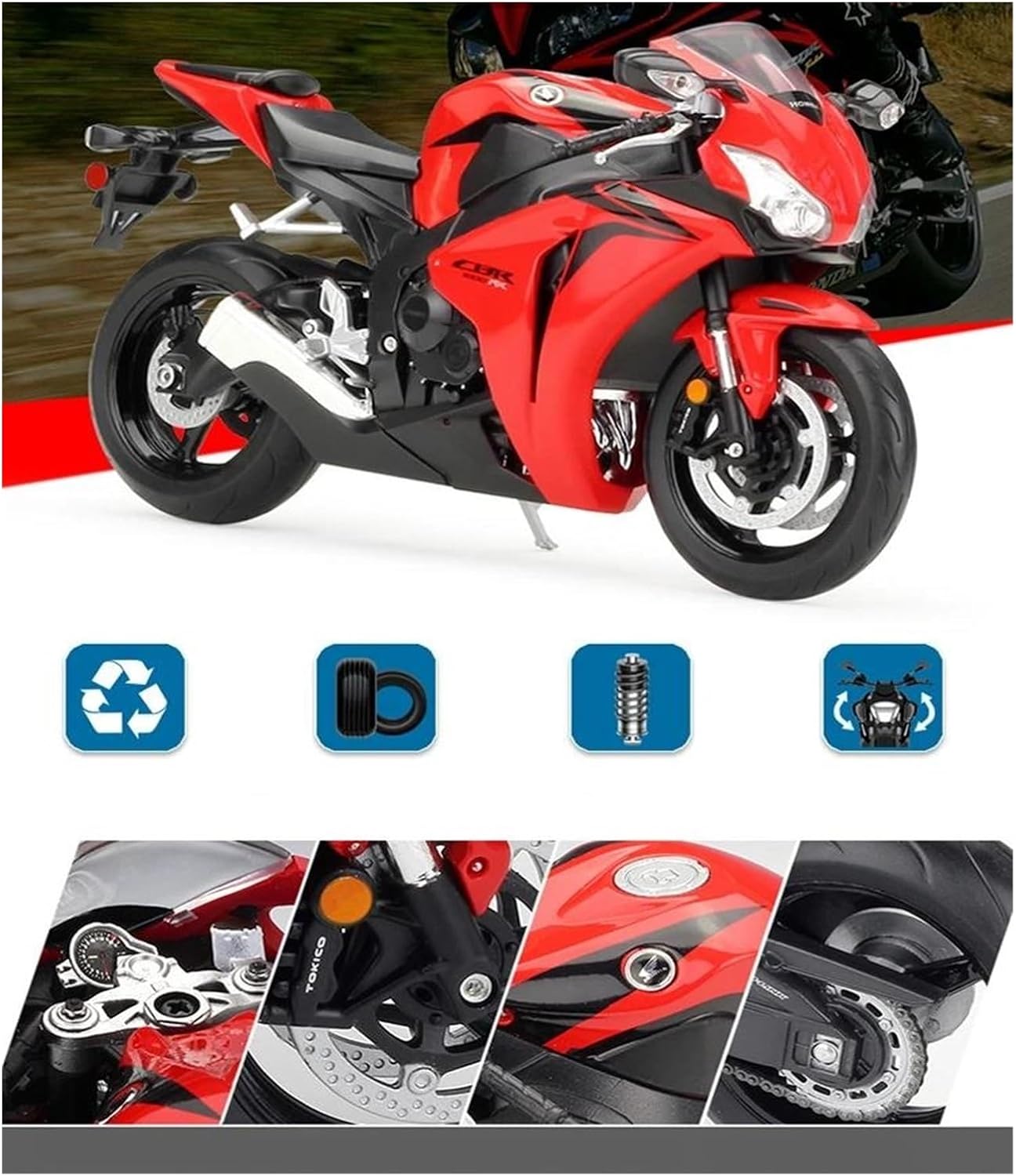 DescriptionProduct Parameters1.Product name 1:10 for HONDA CBR1000RR2.Color: red 3. Material: metal body + ABS chassis + rubber tires4. Body size: about 21.1*8.5*11.2cm5.Category: high simulation car model6.Function 1: Front wheel steering7.Function 2: Rear wheel suspension8.Function 3: Alloy body, strong and durableName: simulation miniature alloy motorcycle model toys, sports racing motorcycle model super off-road cruiser motorcycle vintage iron motorcycle model limited edition static commemorative collection motorcycle model seriesMaterial: alloy + rubber tires + ABS1:Exquisite workmanship2: sturdy and durable3: also far motorcycle of the true proportion of the detailsFunctions: front and rear wheels with shock absorbers/head linkage left and right steering/size kickstand can be put away and put down/press to start the lightsUsage: Parent-child interaction Home office decoration Collection Memorial Christmas Birthday Halloween Thanksgiving Any holiday giftRecommended age:4-6 7-12 18 years old and aboveTips for use:1. Keep away from fire sourceTranslated with DeepL.com (free version)