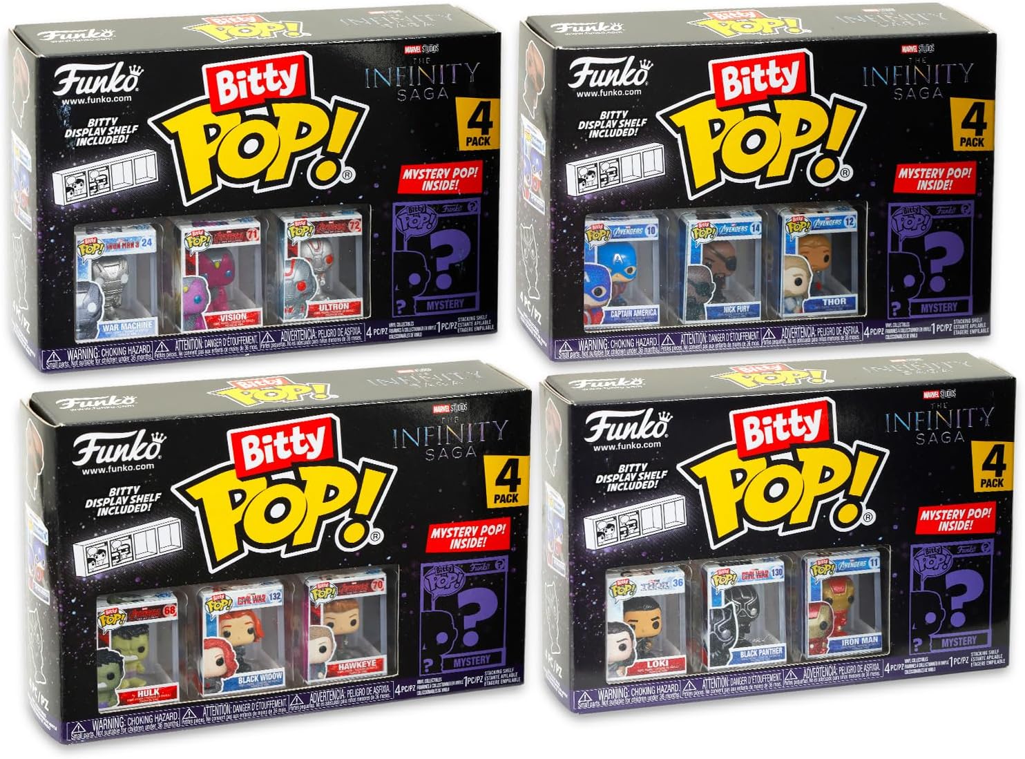 Avengers Funko Bitty Pop 4 Pack - Bundle with Mini Funko Pop Figures of Captain America, Iron Man, Hulk, Thor, Loki, More Plus Stickers | Avengers Mini Figures Collectible Set. This Avengers Funko Bitty Bop set includes 4 Bitty Pop boxes, each with 4 miniature Funko Pops. Bitty Pops include Captain America, Iron Man, Hulk, Thor, Loki, and many more. Each box also includes one mystery figure. Sure to be a hit with Avengers fans, the Marel Funko Bitty Pop mini figures are great to use as party favors, party supplies, goodie bag fillers, gift basket fillers, and more! This Avengers Bitty Pop mini figures box set makes the perfect gift for your favorite Avengers fan. These mini figurines will match any other Avengers merchandise and collectibles! Officially licensed Avengers Funko Bitty Pop 4 pack. Set also comes with Avengers stickers and a Beach Kids superhero door hanger.