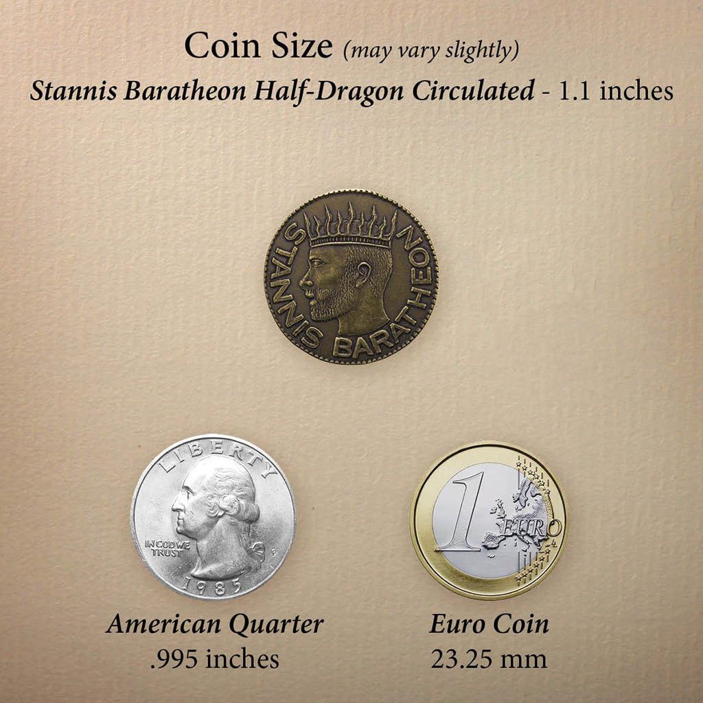 A set of golden coins for some of the major houses of Westeros. These half-dragons are struck in brass and feature a unique depiction of the character along with their house's sigil. Includes: Deanery's targaryen mark of meereen as queen of meereen, surrounded by her three dragons: Drogon, rhaegal, and viserion. On the reverse is a meereenese pyramid and broken manacles, symbolizing her freeing of the slaves. Jaehaerys i targaryen golden dragon, the old king, he was the fourth targaryen king to sit the iron throne. He was the grandson of aegon the conqueror. Aegon i targaryen penny, the conqueror, was the first king on the iron throne. With the help of his dragons and his sister-wives, he united the seven kingdoms under one ruler. This penny features aegon and his wives visenya and rhaenys with a dragon sigil on the reverse. Aegon v targaryen half-penny this coin features aegon v "egg" targaryen with a dragon on the reverse. Aegon was the brother of maester aemon and grandfather of aerys ii targaryen, the mad king.The coins in this set from the world of george r. R. Martin are struck from solid brass, measure 2.6 cm in diameter, and weigh 5.8 grams. Coin artwork by woody maringer, joe paonessa, stan peterson and ron landis. Officially licensed a song of ice and fire merchandise george r. R. Martin. All rights reserved.