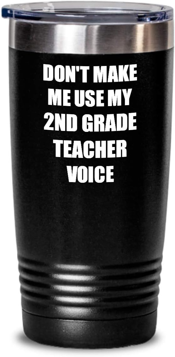 Funny 2nd Grade Teacher Tumbler Coworker Gift Gag Saying Don't Make Me Use My Voice Insulated With Lid Cup Black 30 Oz SATISFACTION GUARANTEED: Absolutely love your order or contact us and we'll make it right. Your satisfaction is 100% guaranteed. HIGHEST QUALITY TUMBLER & UV PRINTING: This large 30 Ounces stainless steel with powder coating tumbler is professionally printed on one side with high-quality ink and techniques to ensure you the best quality on the market. BEST GIFT IDEA: High-quality & funny insulated tumblers, travel mugs, or car commuters, make a great useful present for women, men, friends, family, coworkers, or anyone you're thinking of! Our huge commuter cups with lid are perfect for any occasion, birthday, anniversary, retirement, Mother's Day, Father's Day, Christmas, or just please yourself! Ideal for outdoor activities or indoors at house or the office. ORIGINAL DESIGN, PROUDLY PRINTED AND SHIPPED FROM USA.