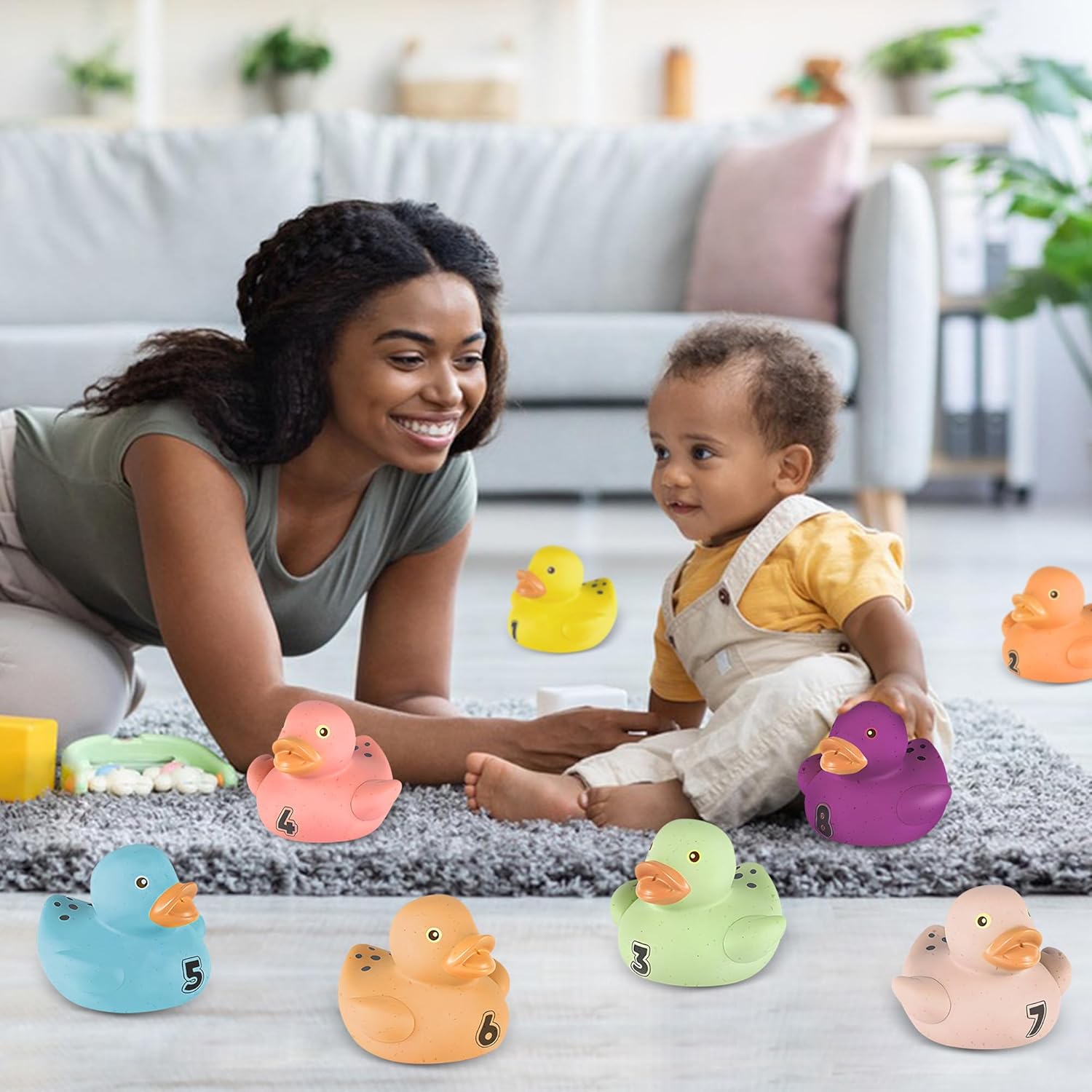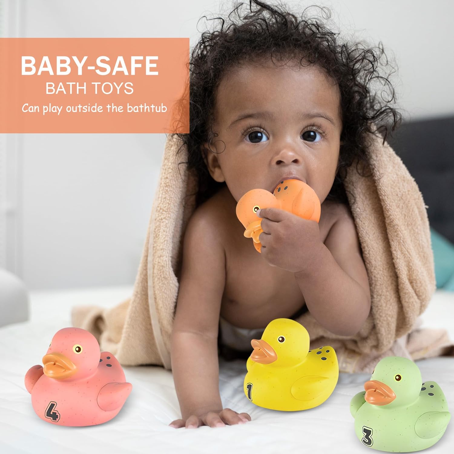 This bath toy bundle combines our Baby Bath Balls and No-Hole Number Duck Bath Toys to turn every bath into a joyful, safe, and educational experience for babies 6–12 months and toddlers 1–3. The Baby Bath Balls feature a hole-free design that keeps water out and gives parents peace of mind. Made from eco-friendly wheat straw material and soft PVC that is free from BPA, these Baby Bath Toys feel gentle on delicate skin and are easy for little hands to grasp, squeeze, and hold. The Bath Toys for Toddlers set includes 6 cool sport balls with a fun sport theme—such as soccer, basketball, football, tennis ball, and baseball—helping little ones recognize different sports ball games while they play in the tub. Smooth surfaces, soft material, and the perfect size make these no hole bath toys comfortable and safe for everyday splashing. Paired with the 8-piece No-Hole Number Duck Bath Toys, this bundle adds even more learning fun to the bathtub. Each duck is crafted from wheat straw material, offering a naturally safe, non-toxic alternative to traditional plastic bathtub toys for kids. The soft, squeezable design and smooth texture are ideal for tiny hands to grasp, squeeze, and explore, whether used as bath toys for kids ages 1–3 or as a Montessori toy for teething babies during tummy time. Every duck is uniquely numbered from 1 to 8 and comes in bright, engaging colors to encourage early number recognition, color matching, and sensory learning. The no-hole design keeps water from getting trapped inside, so there’s no hidden mess—just clean, dry fun after every bath. Durable and hygienic, these no hole bath toys are built to last through countless splashes and giggles. Whether you’re a parent or grandparent looking for Baby Bath Toys or Bath Toys for Toddlers that are fun, functional, and full of early learning opportunities, this bundle of Baby Bath Balls and No-Hole Number Duck Bath Toys is a delightful choice for everyday bath time.
