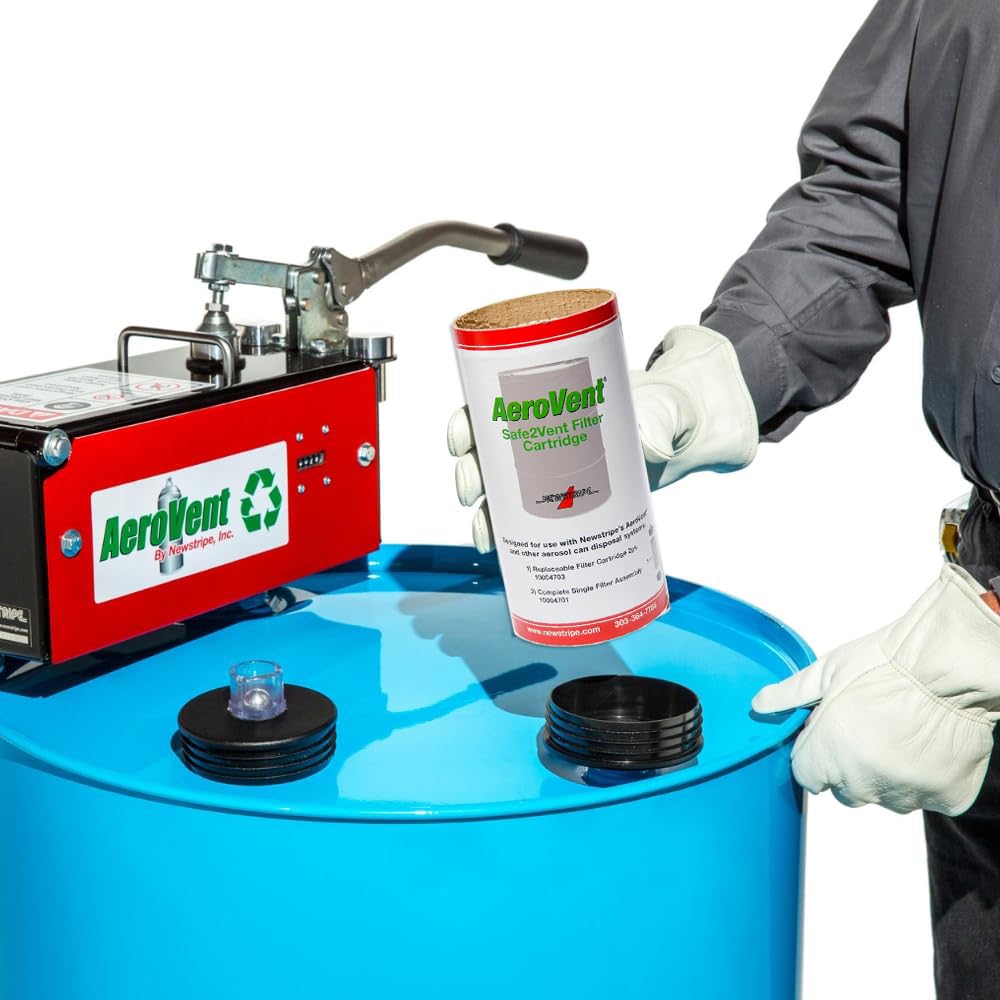 The Safe2Vent Aerosol Disposal Replacement Cartridges 2 Pack features: Universal Design: The Safe2Vent drum vent filter is compatible with all manual, single can aerosol can disposal systems. The reusable base is made to fit the 3/4 inch opening on any steel drum. Exclusive Viz-a-Ball Indicator Check Valve: This revolutionary design serves two essential functions. First, it keeps the operator safe by indicating when the system is completely depressurized and can be opened. Second, the ball check valve complies with OSHA, EPA and California regulations requiring the drum to be closed and prevent vapors from escaping into the atmosphere after processing. The Safe2Vent is the only drum vent filter that includes this important safety feature. Environmentally Friendly: Safe2Vent cellulose construction is 96% biodegradable, man be safely be sent directly to the landfill and decomposes naturally. Other drum vent filters that are plastic encased can take years to breakdown. Safe2Ventcontains more carbon media than any other filter available and will last longer. Plus, each replaceable filter includes the coalescing element for convenient and safe handling. Compliant in all 50 states: Unlike many drum filters, the Safe2Vent aerosol disposal replacement cartridge 2 pack is compliant in all 50 states and conforms to OSHA, EPA and California SB1158 regulations. Newstripe is a top manufacturer of equipment for various applications, including athletic field marking and maintenance, pavement and floor striping, and industrial waste compaction and recycling. With over 40 years of experience, the company is committed to delivering innovative products, exceptional quality, and excellent service to its customers. One of their popular products is the AeroVent aerosol can disposal and recycling equipment, which can puncture and drain up to 3 cans simultaneously, reducing the cost of hazardous waste disposal and generating income from recycling. For baseball and softball infield grooming needs, Newstripe offers six models of infield groomers and drags, from the lightweight, hand-pulled Drag Lite to the rugged, tractor-pulled Dirt Doctor Jr. Their contractor/industrial grade PolyTough parking lot stencils are tough enough to come with a lifetime warranty, and the company offers thousands of industrial stencils in stock, as well as custom-cutting services. With over 20 models of paint striping machines for various surfaces, including roads, parking lots, and factory floors, and 14 models of paint stripers and 4 models of dry line chalkers designed for athletic fields and courts, Newstripe has the right equipment for all your marking needs. Finally, Newstripe's Pack-Master compactors and Big Squeeze crushing machine can reduce waste volume by up to 90%, making them ideal for industrial waste compaction and recycling. With its wide range of equipment solutions and commitment to excellence, Newstripe is a trusted partner for customers in various industries.