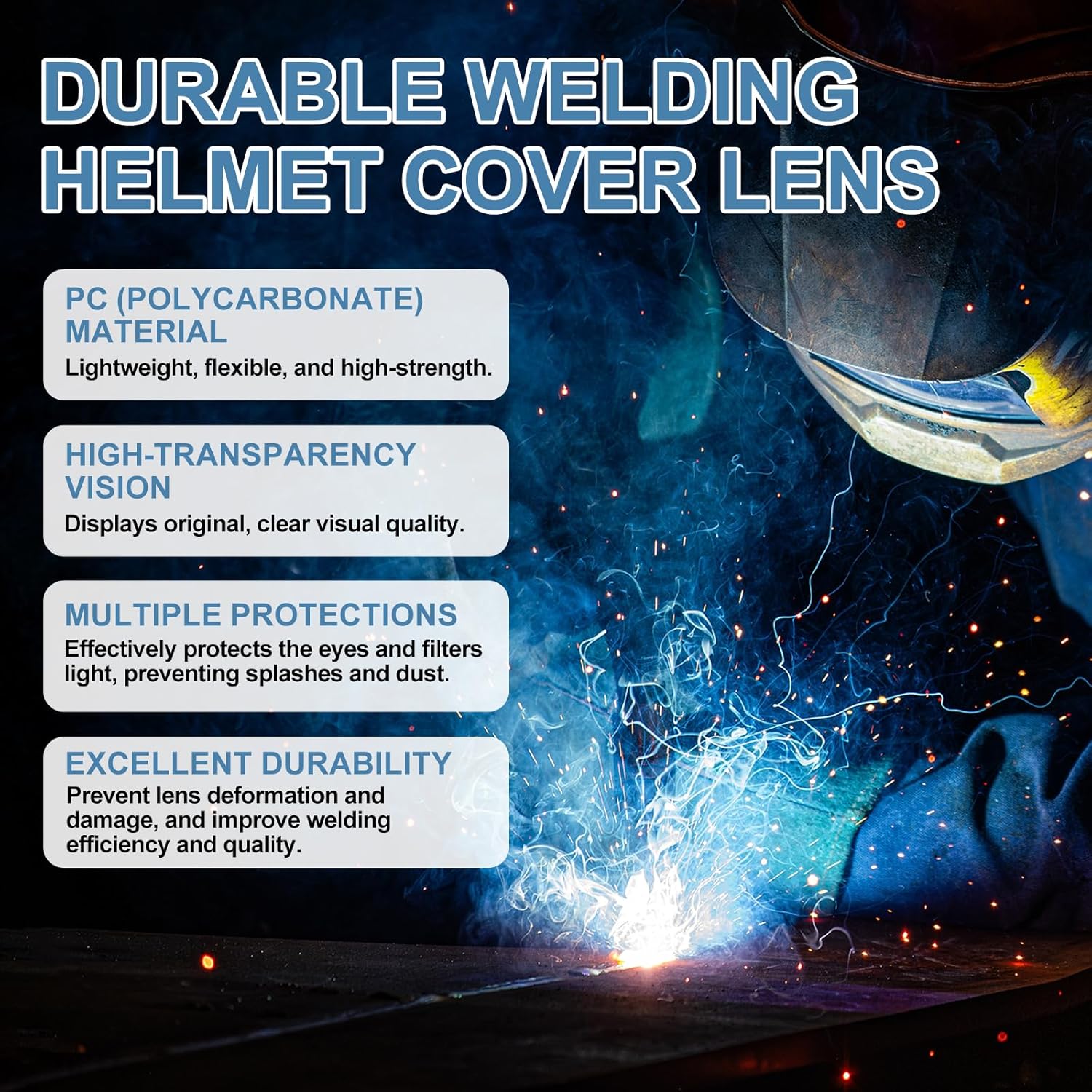 These welding mask spare lenses are suitable for workshops, factories, home decor, cutting, and welding, providing safe and reliable protection for professional welder and DIY enthusiastsAdvantagesMade of robust PC (polycarbonate) material, it is lightweight, flexible, high-strength, and durable. High-transparency vision, multiple protections, effectively protects the eyes and filters light, prevents splashes and dust, prevents lens deformation and damage, and improves welding efficiency and quality.InstructionRemove the protective film from both sides and then attach it to your helmet. This will make welding more comfortable.Note: Suitable for most standard welding helmets. Please select the appropriate size according to your needs, and allow a slight tolerance due to manual measurement.