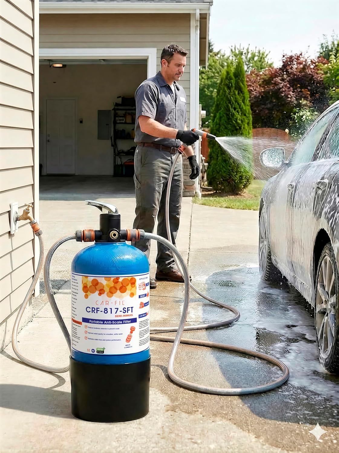 CRF-817-SFT-Semi Manual is a portable, high-efficiency water softening filter that uses a strong limescale-reducing ion exchange resin (sodium-form cation resin) housed in a Fiber Reinforced Polyester (FRP) tank. It helps reduce calcium (Ca²⁺) and magnesium (Mg²⁺) ions in water, minimizing limescale formation and delivering softened water for various mobile and off-grid applications. ________________________________________ Applications RV & caravan fresh water systems Boat & yacht fresh water systems Tiny house & off-grid water systems Mountain & country house water systems Camping site water lines Vehicle washing Exterior glass cleaning Solar panel washing Garden & greenhouse irrigation pre-filtration Personal & mobile water treatment applications Mobile water systems Small-scale home/office pre-filtration systems ________________________________________ Key Benefits ✔ Portable and easy to transport ✔ Quick and easy regeneration process ✔ Significantly reduces limescale and calcium buildup ✔ Helps extend the lifespan of equipment and appliances ✔ Durable FRP pressure tank ✔ Simple valve design for easy operation and maintenance ✔ Quick hose connections for fast installation ________________________________________ Technical Specifications Feature Value Model CRF-817-SFT Product Type Portable Water Softener Filter Tank Material Fiber Reinforced Polyester (FRP) Valve Type Manual / Semi-Manual Connections 3/4" Quick Hose Connectors Max. Operating Pressure 6 bar Recommended Pressure 2–5 bar Operating Temperature 2–40 °C (36–104 °F) Service Flow Rate 0.2–0.6 m³/h (≈ 3–10 L/min) Backwash Flow Rate 0.6–0.8 m³/h Installation Position Vertical Color Options Blue / Black (CAR-FIL standard) ________________________________________ Approximate Softening Capacity by Water Hardness Water Hardness Approx. Treated Water Volume 10 °dH (178 ppm) 4,000–5,000 L 15 °dH (268 ppm) 2,700–3,500 L 20 °dH (357 ppm) 2,000–2,500 L 25 °dH (446 ppm) 1,600–1,900 L 30 °dH (536 ppm) 1,300–1,600 L