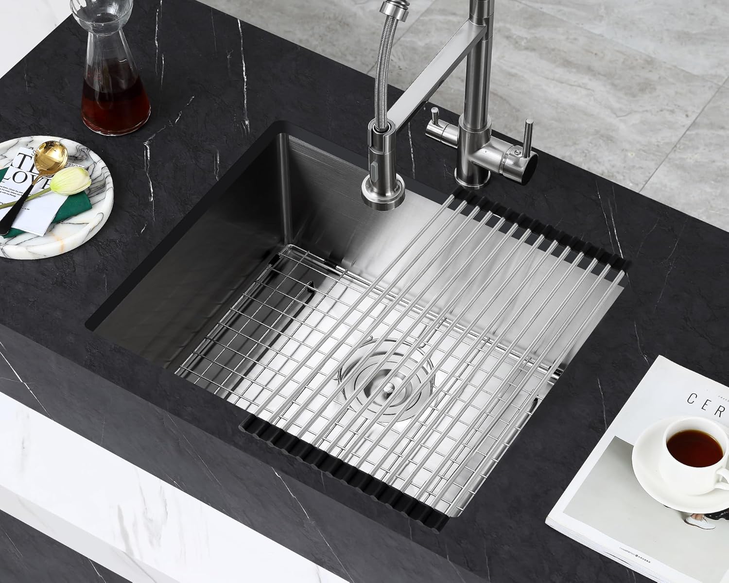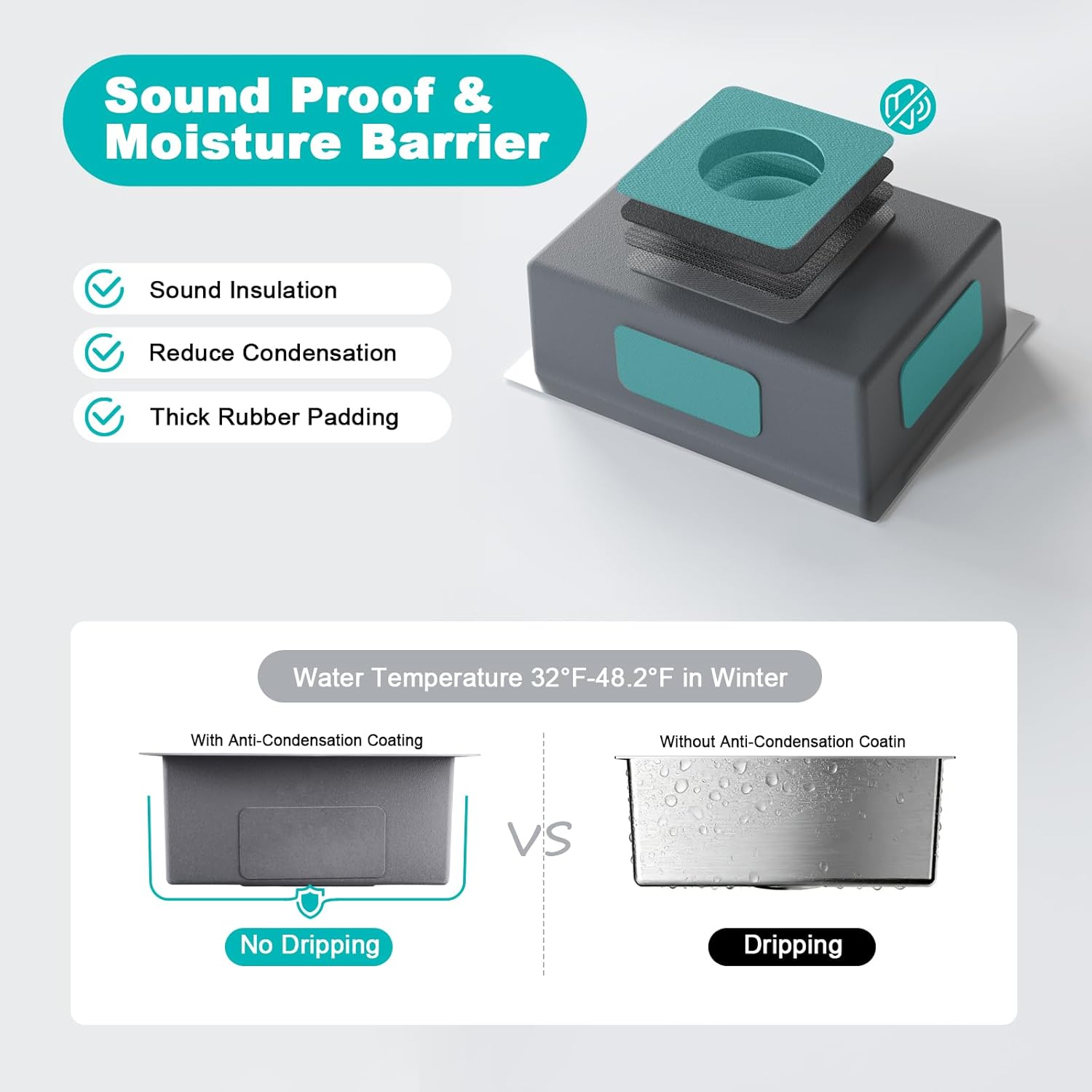 Introducing the 24-Inch Undermount Sink: Space-Smart Design Meets Heavy-Duty Performance The TSIBOMU 24-Inch Undermount Sink is engineered for those who demand professional quality in compact spaces. Combining robust 18-gauge stainless steel construction with intelligent, user-centric features, it’s the ultimate utility solution for modern homes, laundry rooms, and entertainment areas. Specifications: Material: 18-Gauge T-304 Stainless Steel Finish: Commercial Brushed (Scratch-Concealing) Installation Type: Undermount Exterior Dimensions: 24”D x 18”W x 9”H Interior Basin Dimensions: 22”D x 16”W x 9”H Recommended Countertop Cutout: 22” x 16” Drain Opening: 3.5” Standard (Offset Design) Key Features: Laser-Welded Seams, 3mm Sound Pads, 5° Sloped X-Drain Bottom Included Accessories: Roll-Up Drying Rack, Bottom Protective Grid (with rubber feet), Complete Drain Assembly, Mounting Hardware