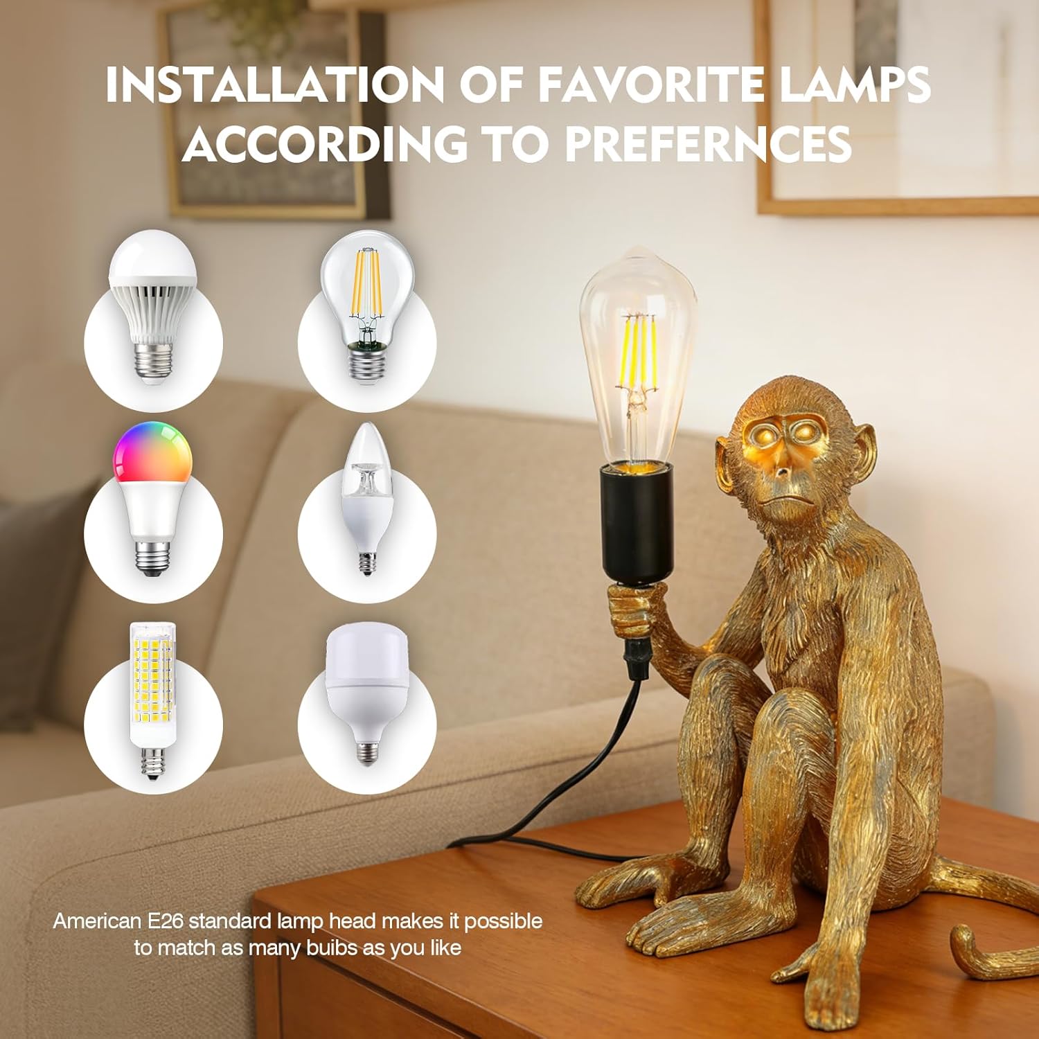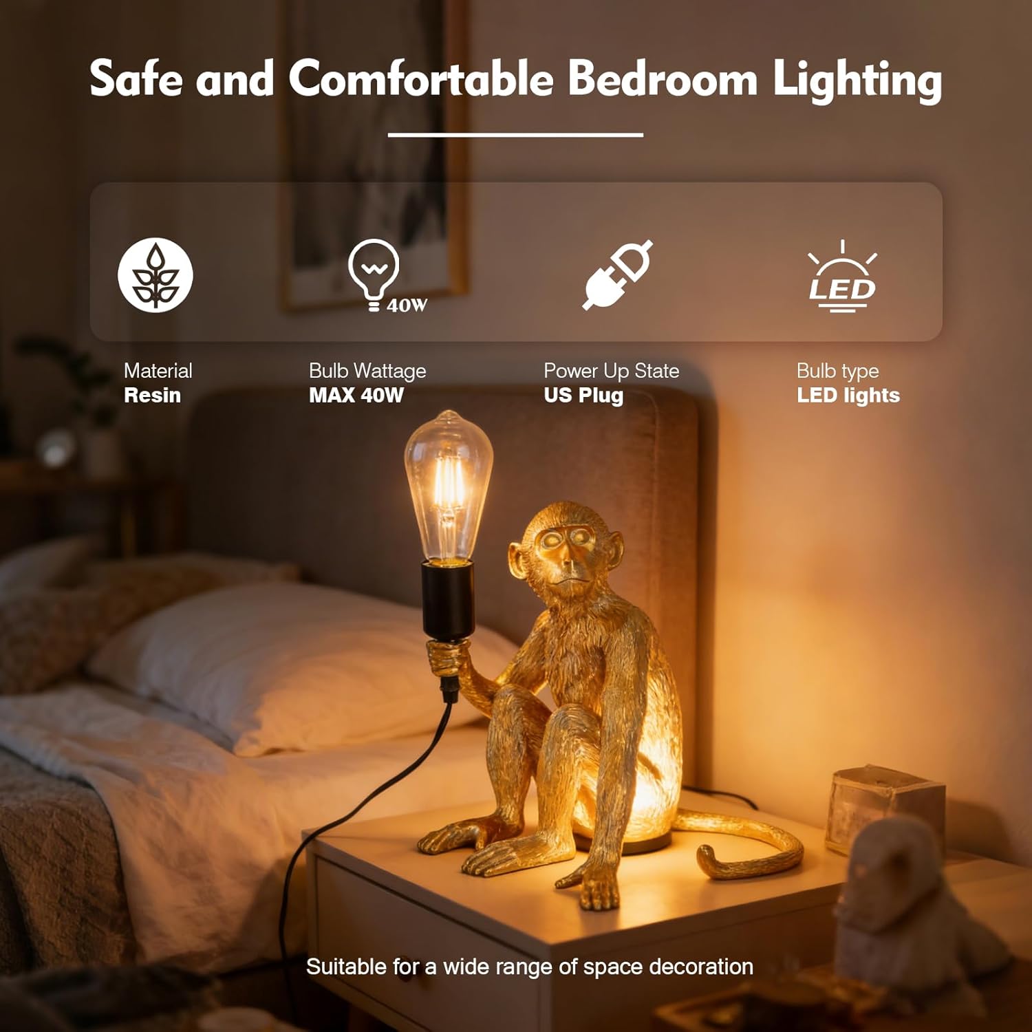 A Fun and Versatile Desk LampThis resin monkey desk lamp adds a touch of personality to your home or office. The monkey, seated and holding a light bulb, perfectly blends playful design, retro charm, and practical lighting, making it an eye-catching work of art. Whether in the bedroom, living room, office, café, or bar, it will instantly become the center of attention and spark conversation.Warm Light Creates Atmosphere — The light bulb in the monkey's hand emits a soft, warm glow, bright enough to illuminate a reading corner while being gentle enough to create a comfortable and relaxing atmosphere. It's ideal as ambient lighting, a decorative accent, or to add personality to your desk, side table, or bookshelf.Durable and Easy to Maintain — This monkey desk lamp is made of high-quality resin with a delicate gold coating, offering a solid and stable feel. The smooth surface can be cleaned with a gentle wipe using a soft cloth, keeping it looking brand new even with daily use.Safe, Stable, and Easy to Use — No installation required; simply place it on a table or shelf and plug it in. The weighted base helps prevent tipping, while UL-certified switches and plugs provide extra safety for everyday indoor use in homes, offices, and commercial spaces, giving you peace of mind.Size and SpecificationsMaterial: ResinColor: GoldStyle: Retro / Industrial / CreativePower Supply: Plug-inVoltage: 110V / 60HzBulb Base: E26Bulb Included: YesInstallation: Desktop / Tabletop PlacementProduct Dimensions: 13.8" × 11.8" × 13.0"Weight: 5.4 lbPackage List1 × Resin Monkey Table Lamp1 × E26 BulbPrecautionsIndoor use onlyPlease place on a stable, flat surfaceWipe gently with a dry or slightly damp clothWhy You'll Love ItThis monkey table lamp adds warmth, charm, and personality to any space. With its lively design, stable construction, UL-certified electronics, and easy installation, this product allows you to enjoy its charm every day—whether placed in your own space or given as a unique and memorable gift.
