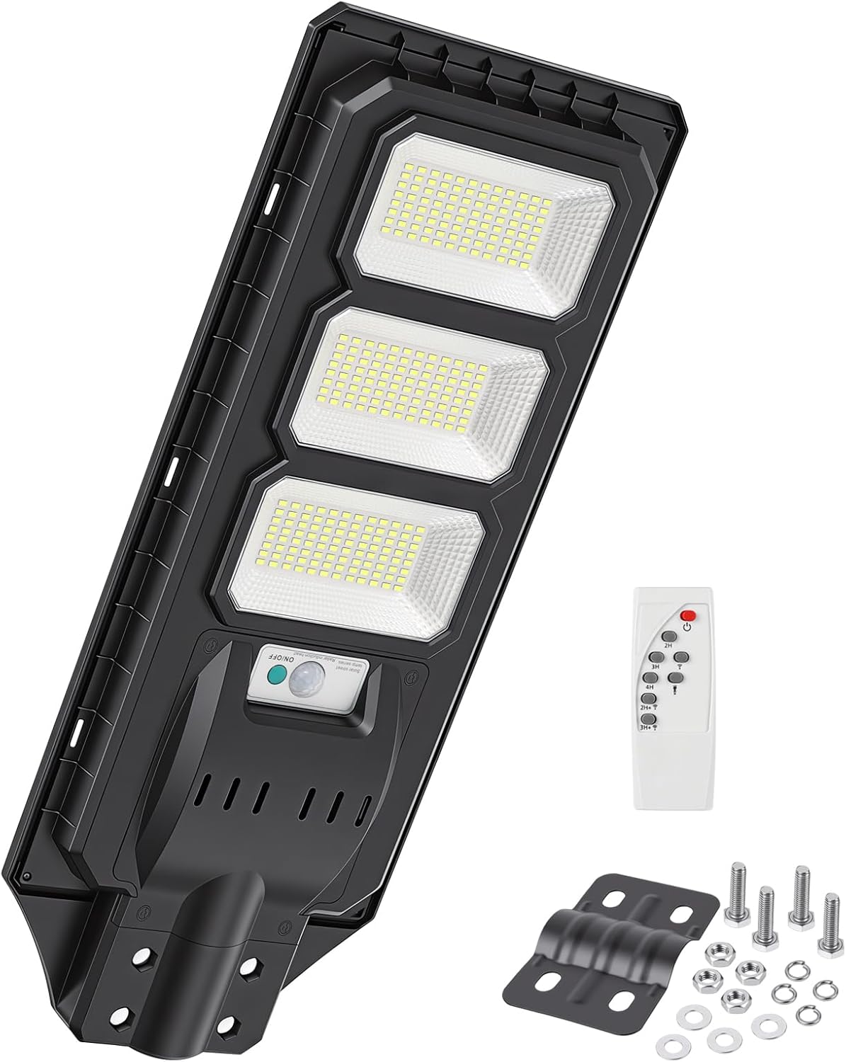 Tips for First-time using solar lights 1. Press and hold the green switch for 5 seconds to activate. 2. Press the switch 3-6 times consecutively to turn on the LED light. The radar sensor willight up red and flash, indicating that the radar sensor has entered radar sensing mode. 3. Ensure that the solar lamp is installed in direct sunlight, so that the solar lamp can be charged normally. 4. When there is insufficient sunlight or cloudy days, it is recommended to use low light mode or radar sensing mode to extend the use time. Efficient Solar Powered Illumination Powered by a 3.2V/30W polycrystalline solar panel, these solar flood lights outdoor boast an impressive 25% solar energy conversion rate. With a 5000mAH battery fully charging in 4-6 hours, these solar street light provide continuous lighting for 6-8 hours. Control at Your Fingertips Experience convenience with our solar street lights outdoor. Equipped with a sensitive motion sensor covering 120-200 inches, these solar motion lights outdoor are ideal for front doors, walkways, patios, and even serve as commercial solar Lights or brightest solar outdoor lights. Versatile Dusk To Dawn Operation Enjoy multiple modes tailored to your needs: Motion Sensor mode offers 100% brightness when detecting proximity and dims to 30% when inactive. Timed mode allows for preset lighting durations (1h/2h/3h/4h) before switching to motion sensor mode. Durable and Waterproof For All Environments Our IP66 waterproof outdoor solar light is constructed with high-quality ABS and metal bracket, ensuring sturdiness and durability. This design is well-suited for outdoor environments, effectively withstanding challenges such as rainy days, high temperatures, low temperatures, and other harsh conditions. Choose our luces solares para exteriores for reliable and efficient outdoor lighting.