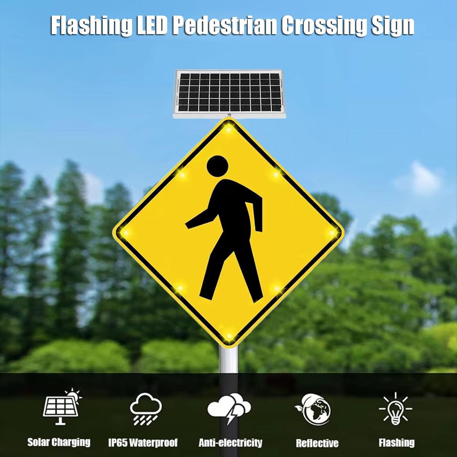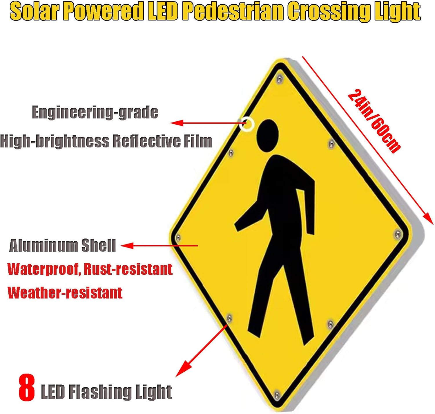 Introducing our 24" Flashing LED Pedestrian Crossing Sign, a reliable street traffic warning sign designed to enhance safety in busy pedestrian areas. Crafted from heavy-duty, rust-proof aluminum, this road warning sign is built to withstand the elements while providing clear visibility for both pedestrians and drivers. With a size of 60cm x 60cm (24 x 24 inches) and an impressive visual distance of over 800 meters, this solar-powered pedestrian crossing light ensures maximum visibility during the day and night. The engineering-grade reflective film enhances its effectiveness, making it an ideal choice for urban environments, school zones, and construction sites. Our solar LED pedestrian crossing sign features eight high-brightness yellow LEDs that flash at a frequency of 40-60 times per minute, drawing attention to the designated crossing area. Designed for all weather conditions, it operates efficiently in temperatures ranging from -40℃ to 60℃, and its IP65 waterproof rating guarantees durability in rainy weather. The sign's integrated solar panel (12V, 5W) charges in just 6-8 hours, providing battery life of 96-120 hours after a full charge, ensuring continuous operation even on cloudy days. Installation is straightforward with the included U-shaped clamp, compatible with pole diameters of 76mm and 89mm, allowing for easy setup in various locations. Upgrade your safety measures with our Solar LED Pedestrian Crossing Light—an essential tool for promoting pedestrian safety and enhancing traffic management. Order now to make a significant impact on road safety in your community!
