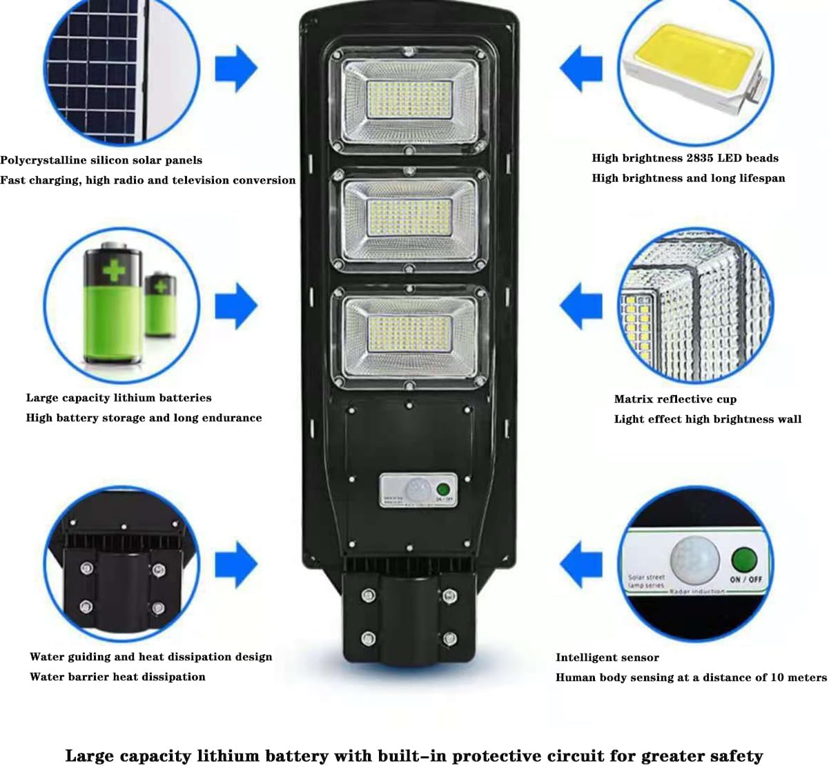 Input voltage: 3.2 (V) Number of LED beads: 120 Luminous flux: 2000 (LM) Color temperature: 6500 (K) Color rendering index: 75 Light distribution method: LED Shell material: ABS Size: 478 * 195 * 55 (mm) Lifetime: 100000 (H) Weight: 2400 (g) Illumination angle: 180 Average illuminance: 180 Working temperature: -20-50 Protection level: IP65 Scope of use: Road lighting, outdoor lighting, lighting Power: 30W, 60W, 90W, 120W, 150W (W) Light color: True white Power supply method: solar energy