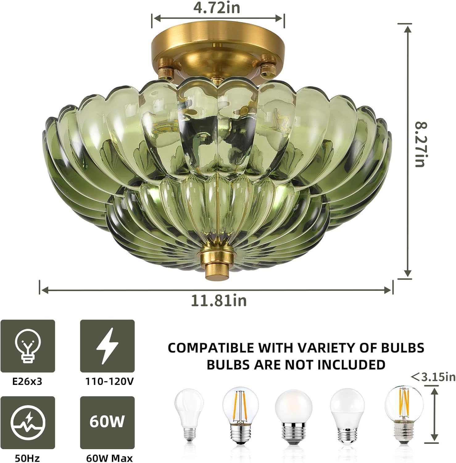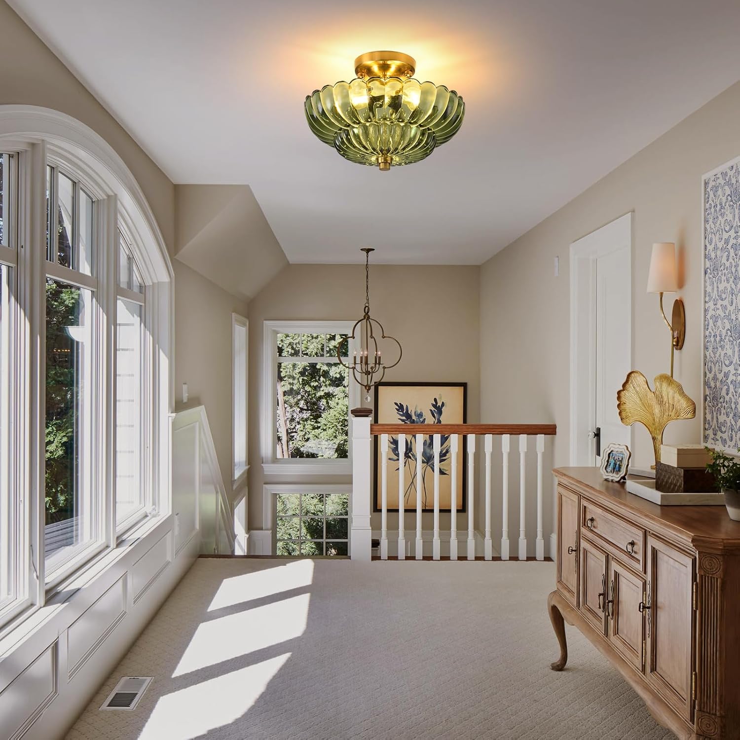Semi Flush Mount Ceiling Light, 11.8 Inch Gold Vintage Hallway Light Fixture with Green glass, Close to Ceiling Light For Bedroom Kitchen Living Room Bathroom Foyer, E26 Base
