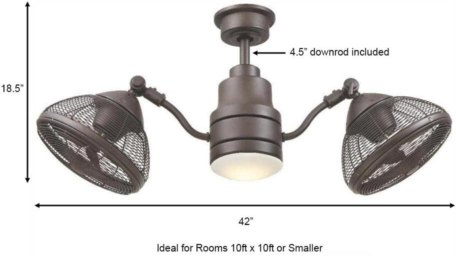 The Home Decorators Pendersen 42 in. LED Espresso Bronze Ceiling Fan has a unique dual cage design that can oscillate in both directions. The light kit has a 14-Watt LED Samsung module that is set at 3000K color temperature for an incandescent feel, which is also dimmable. Each cage can also adjust for either straight down or at 2 different angles. The hand held remote controls the oscillation, speed and light, battery included. Comes with a 2 year parts warranty and a lifetime motor warranty. 360° oscillating twin cage design Adjustable cage angles Uses one 14-Watt LED Samsung light source 3000K color temperature Dome style light with frosted glass 4 blades per fan cage Hand held remote control that controls oscillation, fan speed and light Large room: 16 ft. x 16 ft. Lifetime motor warranty Damp rated for outdoor covered areas