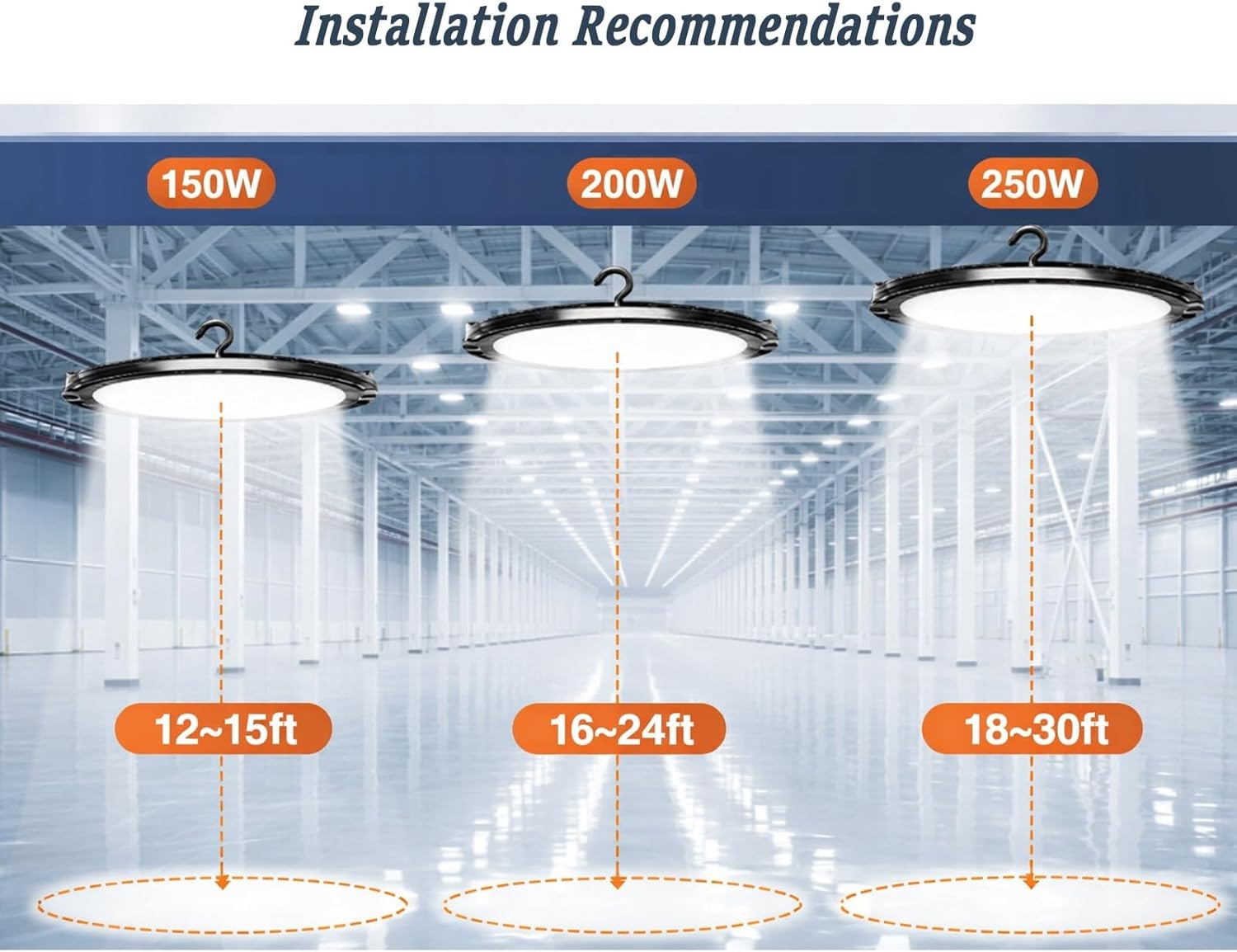 SpecificationsLED Chip:2835Color Temperature: 6000KInput Voltage: AC 100-277V, 50/60HzHousing Material: Die-Cast AluminumLens Material: PC Honeycomb LensProtection Rating: IP65Model-Specific Data:100W: Approx. 10,000-11,000 lm | 120 LEDs | Ø245mm150W: Approx. 15,000-16,500 lm | 180 LEDs | Ø285mm200W: Approx. 20,000-22,000 lm | 240 LEDs | Ø335mm300W: Approx. 30,000-33,000 lm | 396 LEDs | Ø400mmRecommended Applications:Warehouses and logistics centersIndustrial workshops and manufacturing plantsGyms and sports hallsLarge retail stores and supermarketsParking garages and maintenance shopsImportant Note:We continuously improve our products. The appearance and specifications may undergo minor changes occasionally. Please refer to the physical product you receive.