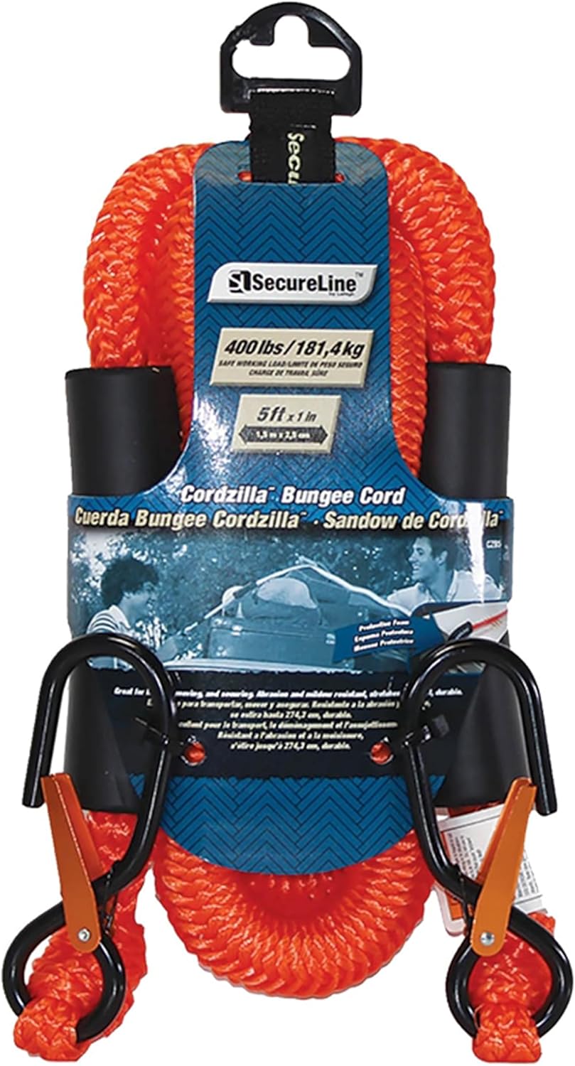 Product Description 4', yellow, stretch rope, vinyl coated steel hook, protects paint, Anodized aluminum safety clip, secures to anchor, moveable protective foam sleeve, 400 LB load limit From the Manufacturer This yellow, 4-Foot Cordzilla stretch rope from Lehigh has a safe working load of 400-Pounds. The rope features an 8 millimeter bungee encased inside a flexible polypropylene rope to create an extra strong, extra safe, multi-purpose tie-down; no longer will you have to worry about he bungee breaking. The hooks have been developed with an extra wide openings to clamp onto most roof racks, truck beds, or boat trailers. The bungee rope also has aluminum safety clips to secure load.