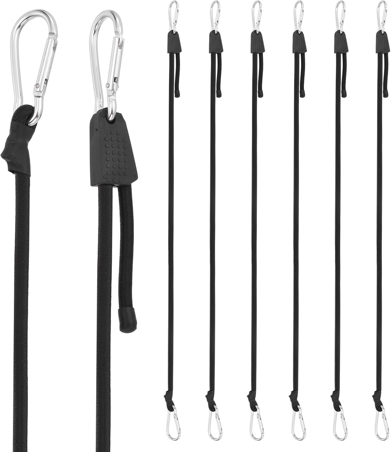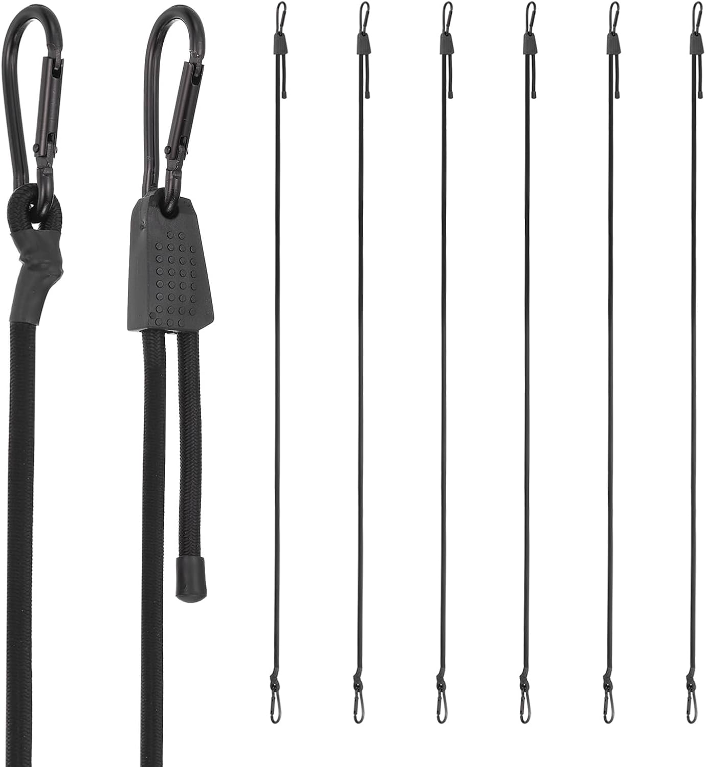 Reasons for selection - The bungee cord stands out due to its upgraded model process and material, offering three times the pulling force and strong rebound compared to ordinary rubber cords. Made of polyester, it ensures good load capacity and a longer service life, making it a reliable choice for various needs.Measurement - Length:7-80 inch; Wire Diameter: 8 mm/0.31 inchSuitable for - These elastic tie-down straps are suitable for all weather conditions, being waterproof and weather resistant. They can be used to secure cargo on cars, trailers, RVs, motorcycles, and bicycles, as well as for daily uses like hanging doors, blinds, or Christmas garlands, making them versatile tools for both indoor and outdoor activities.Installation -The adjustable bungee cords with hooks allow quick and easy attachment. Simply stretch and hook to secure items in place, ensuring stability even during movement.Kind Tips - Avoid overstretching to maintain elasticity and longevity.