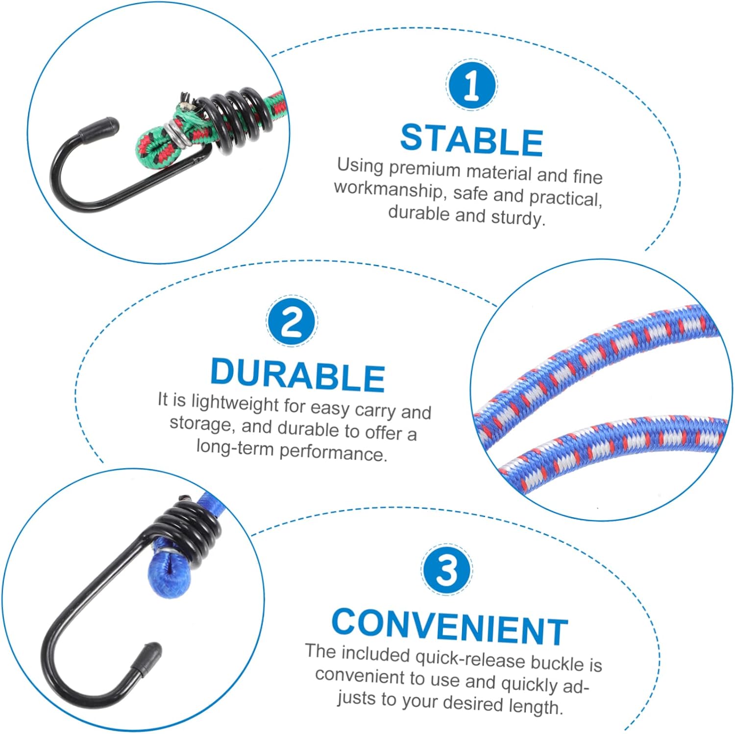 Package Include 6 x 30cm ropes 6 x 40cm ropes 4 x 60cm ropes 2 x 80cm ropes 2 x 100cm ropes Characteristics -Color:Assorted Color heavy duty bungee cords -Size: 100.00X2.80X2.00cm/39.30X1.10X0.79 in roof rack bungee cords. -Length: 30cm/ 40cm/ 60cm/ 80cm/ 100cm Luggage Straps. -Material: Rubber bungee cords heavy duty - Vintage style decorative bungee cords are perfect for wrapping, DIY crafts and swing bed bungee cord. - Can be easy to use , no harmful substances, will not damage your items easily small bungee cord. - Heat resistant, versatile and can be used as decor, climbing plaster rope, fence decor and more outdoor elastic rope strap. - This bungee cord is and thick, hard to tear or break, long enough and can be cut according to your needs outdoor multi-purpose binding strap. - and material, multi-functional for use, you can safely use it for decoration or binding camping elastic straps.Goods Descriptionoutdoor bungee cord Suitable for decorating craft, and more.bungee straps This bungee cord will help you create more crafts and hold items with hooks design.bungee cord Craft projects are always fascinating to us, since you can decorate your favorite favors with the various items.bulk bungee cord Made of , the product is and for use