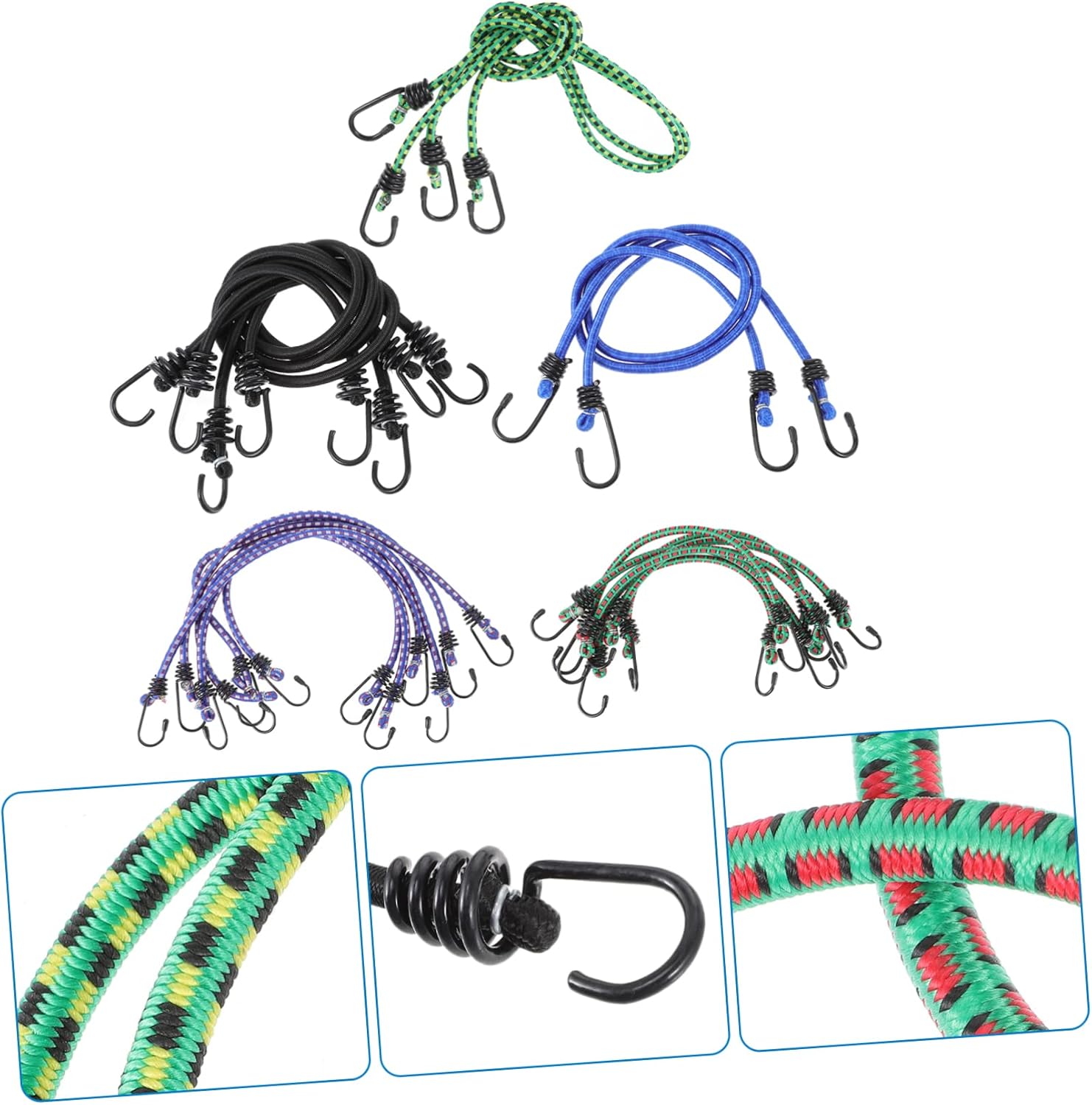 Package Include 6 x 30cm ropes 6 x 40cm ropes 4 x 60cm ropes 2 x 80cm ropes 2 x 100cm ropes Characteristics -Size: 100.00X2.80X2.00cm/39.30X1.10X0.79 in. bungee cord bundle -Color: Random Color bungee cords assorted sizes -Length: 30cm/ 40cm/ 60cm/ 80cm/ 100cm bungee cords heavy duty outdoor. -Material: Rubber bungee cords heavy duty - Can be easy to use at home, no harmful substances, will not damage your items easily. bungee strap - Heat resistant, versatile and can be used as stairwell decor, climbing plaster rope, fence decor and more bungee cords. - Vintage style decorative bungee cords are for wrapping, DIY crafts and swing bed bungee straps. - This bungee cord is and thick, hard to tear or break, long enough and can be cut according to your needs. heavy duty bungee cords - and material, multi-functional for use, you can safely use it for decoration or binding camping accessories.Goods Descriptionbungee cords This bungee cord will help you create more crafts and hold items with hooks design.bungee cords heavy duty Craft projects are always fascinating to us, since you can decorate your favorite favors with the various items.bungee cord bundle Suitable for decorating craft, and more.camping accessories Made of materials, the product is and for use