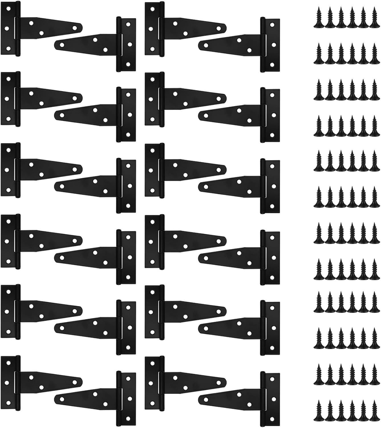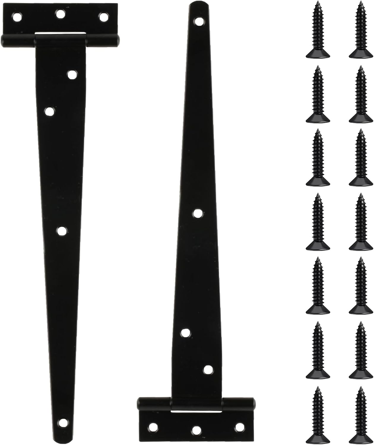 What are the advantages of our barn door hinges heavy duty? ✅ Our barn door hinges heavy duty is made of high-quality iron material, galvanized surface, corrosion-resistant, scratch-resistant, durable. ✅ Equipped with mounting screws for smooth operation and easy installation. ✅ These fence door hinges are designed with 180 degree opening and closing angles to provide maximum support and security for your gate. ✅ Suitable for shed doors, patio doors, garden doors, wooden doors, warehouse sheds, barn doors, gates, etc. Features: Material: Iron, Galvanized Color: Black Size: As shown Package Includes: 6 x Black Heavy Duty T-Strap Hinges Warranty after sale: If you have any questions about the heavy duty gate hinges, please contact us in time, and we will solve your questions ASAP. Warm Tips: Dimensions are measured manually, please allow slight errors. Color may vary slightly from the online image due to your monitor color settings, please refer to the actual product, thank you for your understanding.