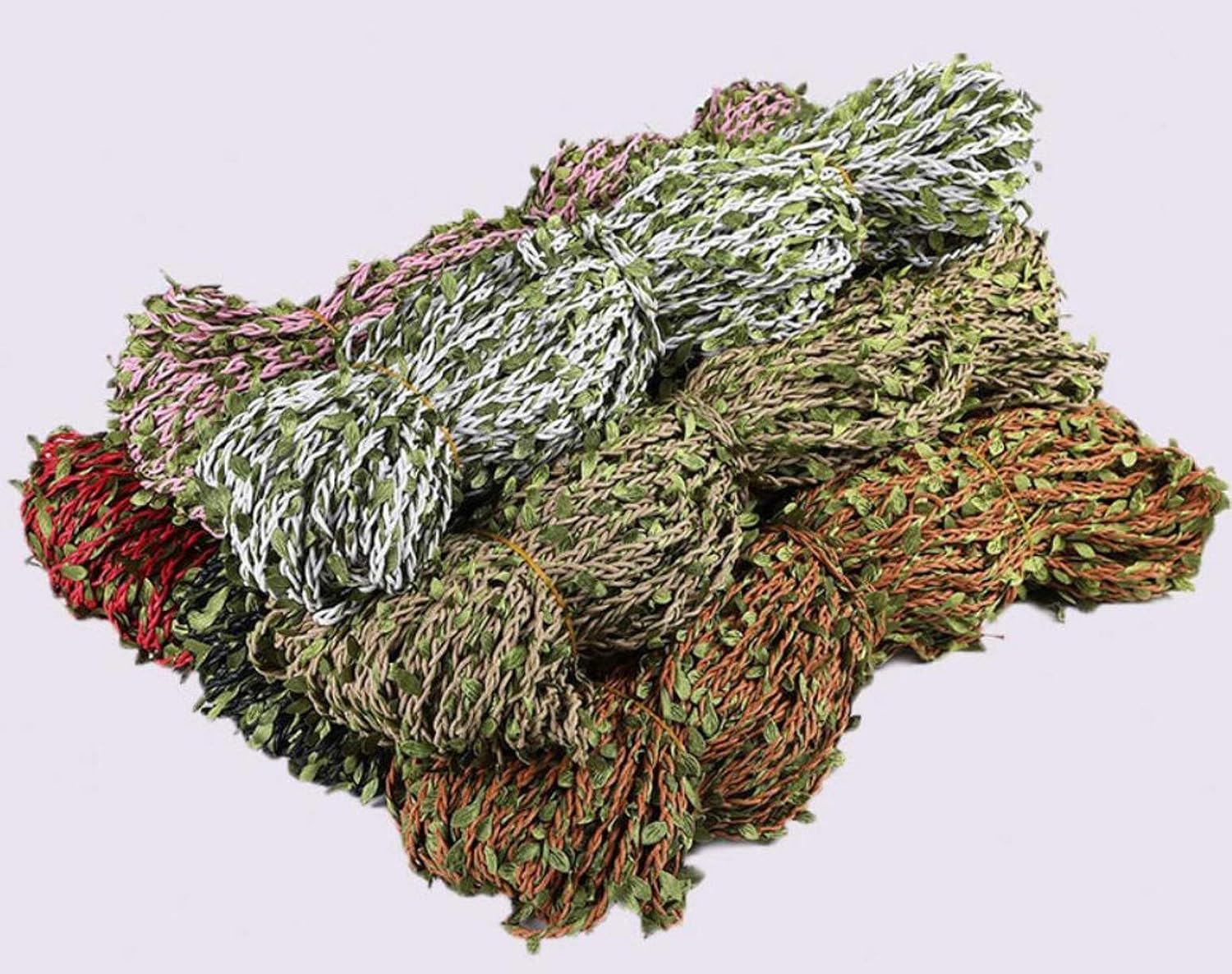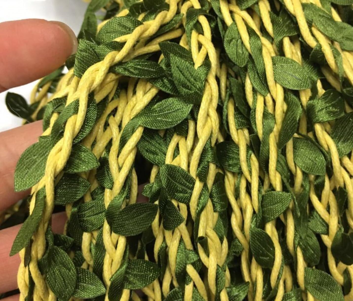made of polyester Color: Light Yellow stem Each roll of burlap twine with leaves measures 328 feet (100m), and each leaf measures 0.39 inch (10mm) Wide Application: The burlap twine is perfect to add a natural look, a great decoration for flower shop, photo wall, gardening, farmhouse, DIY, handicrafts, wedding, party, inside or outside, festival events, etc Durable and Reusable: Our jute rope is soft but strong, it can be used for a long time, and gives you a natural touch.