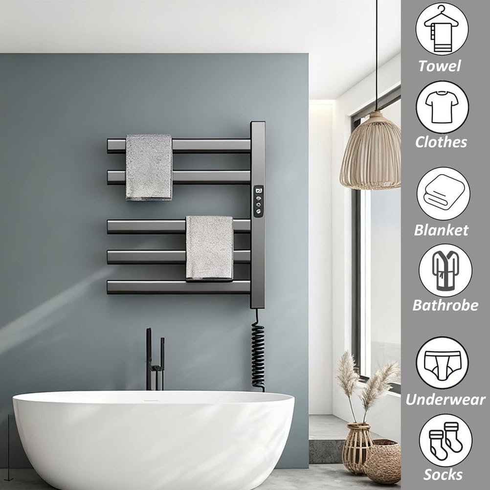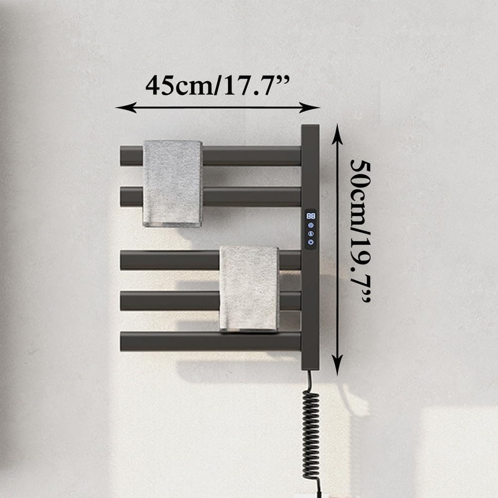Elevate your bathroom experience with our Aluminum Alloy Heated Towel Rack, a perfect blend of functionality and modern design. This smart heating towel warmer is ideal for any home, providing a constant temperature range of 30-70°C (86-158°F) to ensure your towels are always warm and ready for you. Crafted from durable aluminum alloy, this towel rack is not only stylish but also resistant to water with an IPX5 rating, making it suitable for moist environments like bathrooms, spas, and beauty salons. The sleek black, gray, or white finishes allow it to seamlessly integrate into various decor styles, enhancing the aesthetic of your space. With a power output of 150W, this towel warmer features a user-friendly touchscreen control panel, allowing you to easily set a timer between 1 to 9 hours. Whether you're coming out of a relaxing bath or preparing for a busy day, you can trust this towel rack to deliver the warmth you deserve. Designed for versatility, our wall-mounted heated towel rack is perfect for hotels, restrooms, balconies, swimming pools, bathing centers, and more. Transform your daily routine into a luxurious experience as you wrap yourself in warm towels after each shower. Included in the package are the heated towel rack and mounting accessories, ensuring a straightforward installation process. Please note that due to manual measurement, some dimensions may vary slightly, and actual product colors may differ from images due to lighting and monitor display. Upgrade your bathroom with the ultimate convenience of our Aluminum Alloy Heated Towel Rack and enjoy the comfort of warm, dry towels every day.