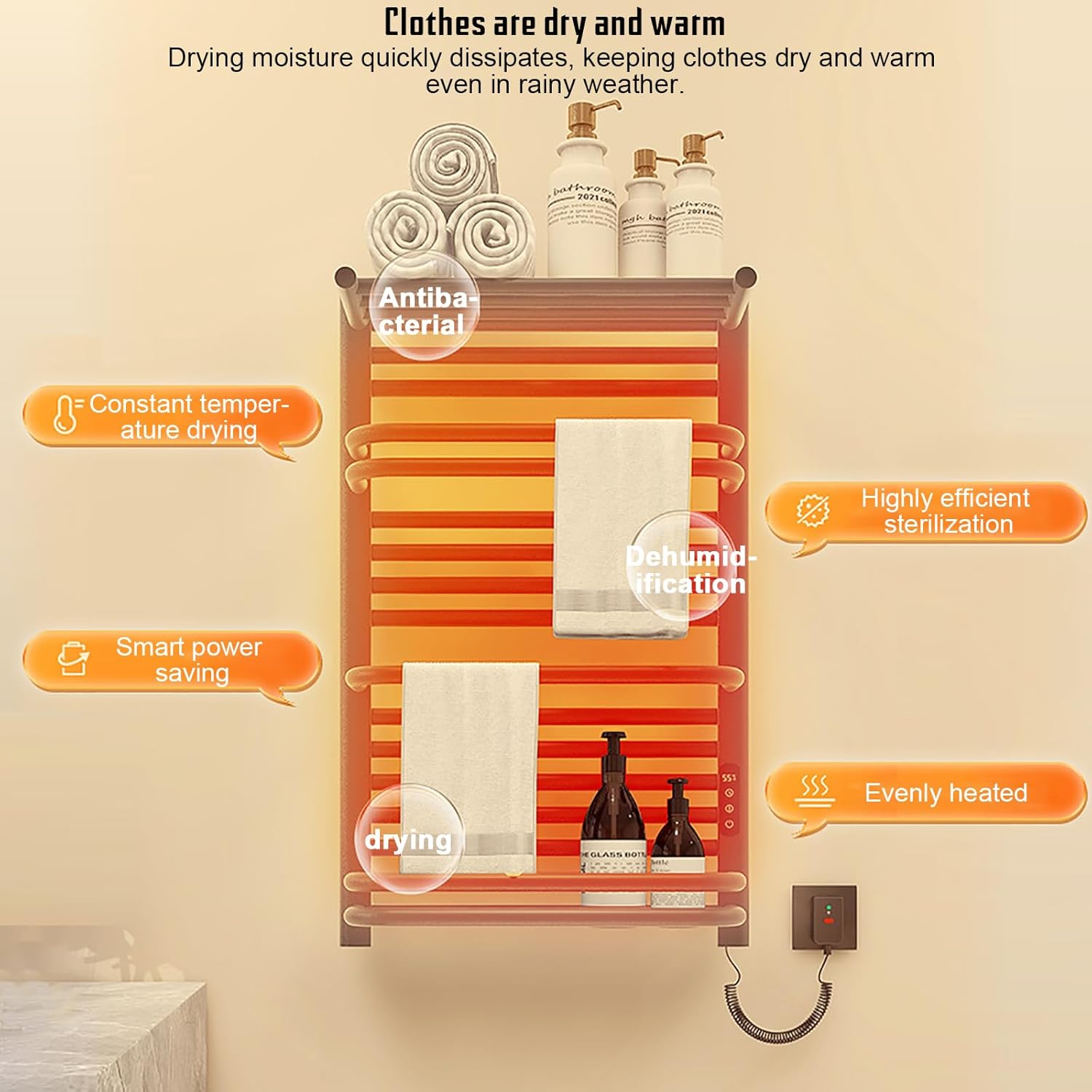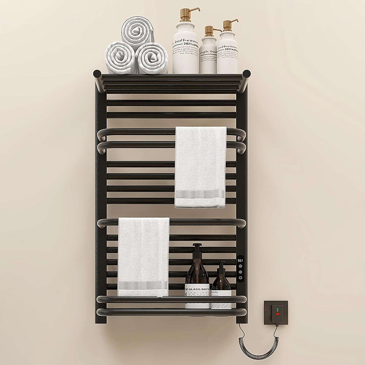 This towel rack is made of selected aluminum alloy tubes, which are smooth and waterproof, making it highly rust-resistant and easy to clean. 12 horizontal bars plus an upper and lower storage tray provide ample space for your towels and socks. This heated towel rail has a space-saving wall-mounted design that's perfect for any room.Product Name: towel warmer rack/electric towel warmerBody material: SPCC low carbon steelTemperature control range: 30-70℃Timing mode: 1-9HWaterproof level: IPX5Product size: 500*800*265MMProduct weight: 8.5KGPower cord length: 1.5M spring cordPackage Contentsheated towel warmer x1Notice1. Due to manual measurement, there may be an error of 1-3cm.2. Due to differences between monitors, the picture may not reflect the actual color of the item.3. If you have any questions, please contact us via email.