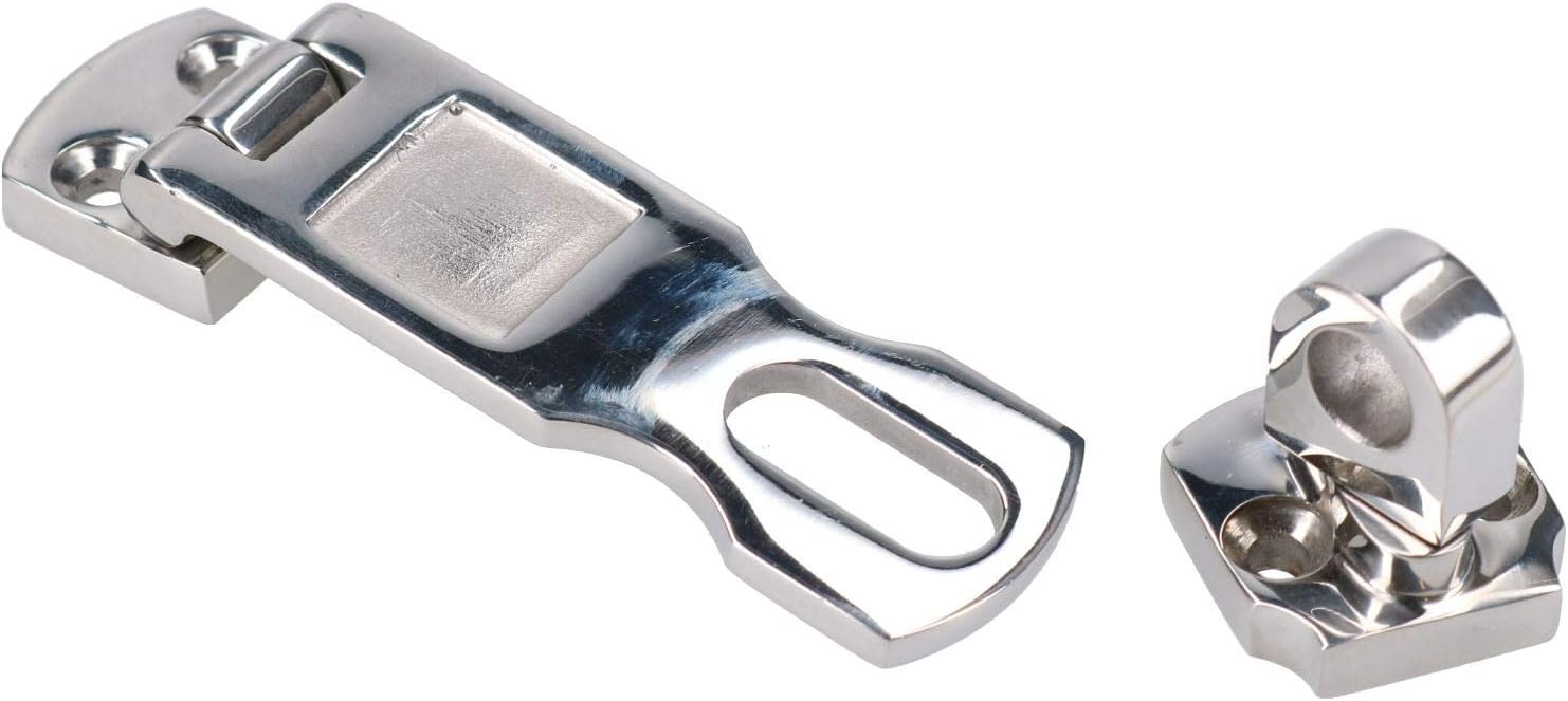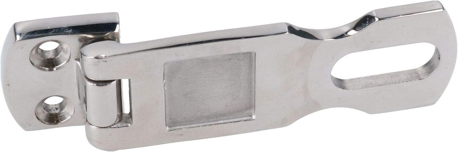 A high quality hasp and staple, perfect for cabin hatches, lockers etc... Made from top quality marine grade stainless steel. AISI 316 Graded. Mirror polished finish. Heavy duty design made from thick, cast components. Swivel type design means the hasp can be held closed without having to insert a padlock. Can be used folded in to conceal the mounting holes or can be flipped over and used open out where a longer hasp is required. Total length (Folded in); 78mm Height 26mm. Depth 30mm. 10mm hole for padlocks to go through.