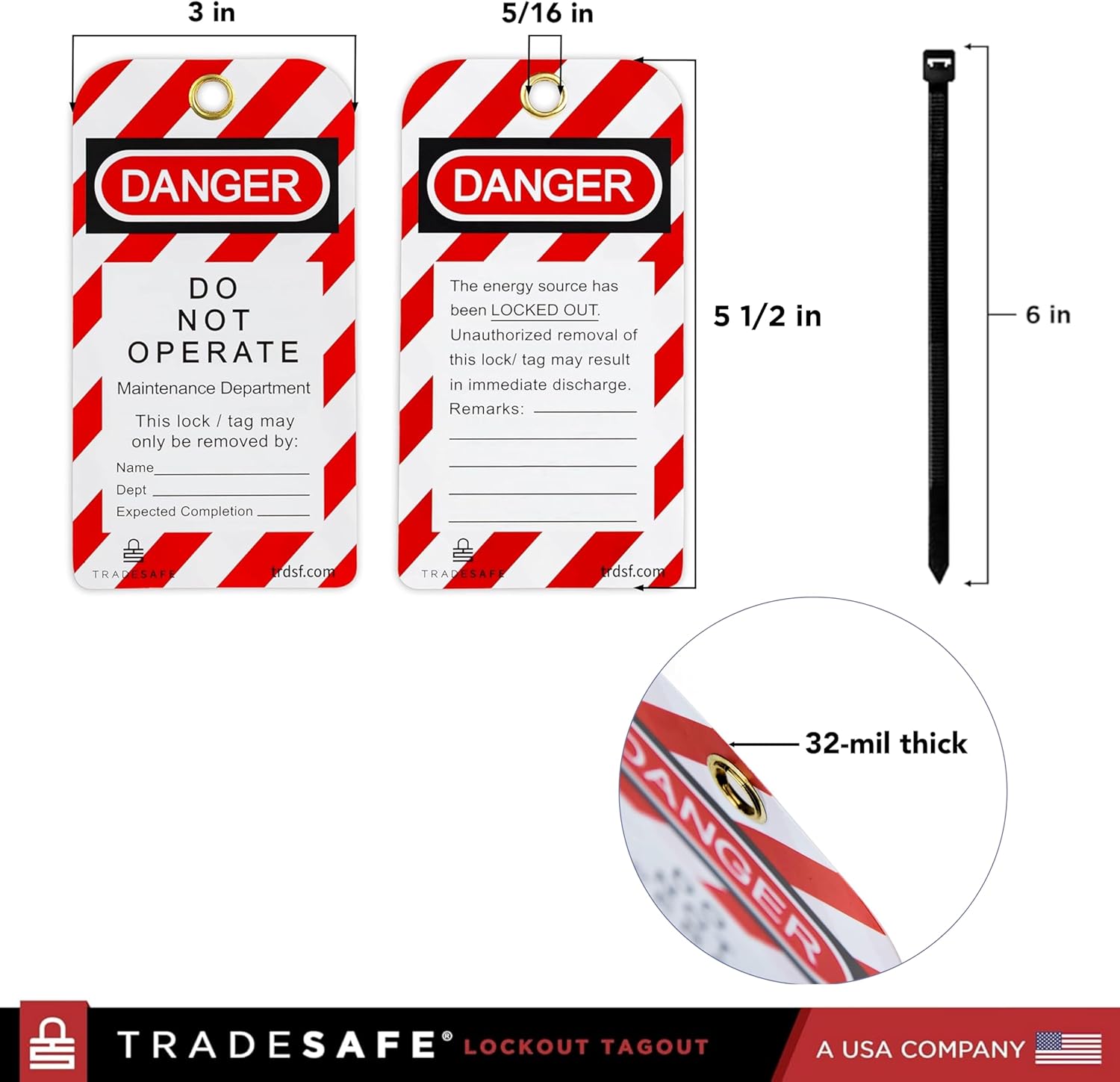 Lockout tagout hasps: Body Length: 4-1/2-inch Body Width: 1-3/4-inch Inner Jaw Diameter: 1-inch Padlock Hole Diameter: 3/8-inch Lockout tagout tags: Dimensions: 5-1/2 inch x 3-inch Thickness: 32 mil Tie hole diameter: 5/16-inch Material: PVC Vinyl TRADESAFE lockout hasp designed and manufactured with premium materials for a safe and long-lasting lockout. Each safety lockout hasp is made of corrosion-resistant chrome-plated steel jaw and double-layered nylon injection molded handle, a substantial improvement over the standard competing brands. It also features a vibrant red color, so it remains easy to spot anywhere in the facility and helps keep workers alert of ongoing lock out tag out procedures. These lockout tagout hasps can be clipped onto shafts, switches, and other machinery. With 6 padlock holes to support six lock out tag out padlocks, this 6 lock hasp also enables group lockout tagout procedures on a single piece of equipment. This way, no individual can re-energize the power source until all workers are done with the maintenance or service. TRADESAFE tag out tags feature vibrant colors with bold "DANGER - Do Not Operate" heading for maximum visibility. It also has a generous size, so workers can legibly record electrical lockout tag out logs and read critical information at a glance without interrupting their workflow. These electrical lockout tags also have a smooth surface that allows seamless writing with the use of permanent markers or wax/grease pencils. Each equipment tag out tag has a tough brass grommet to increase use life by preventing the splitting of the vinyl and resisting abrasion caused by frequent use, vibration, and mechanical movements. Suitable for both indoor and outdoor use. Choose excellence in lockout safety supply. Choose 100% OSHA compliance. Choose TRADESAFE.