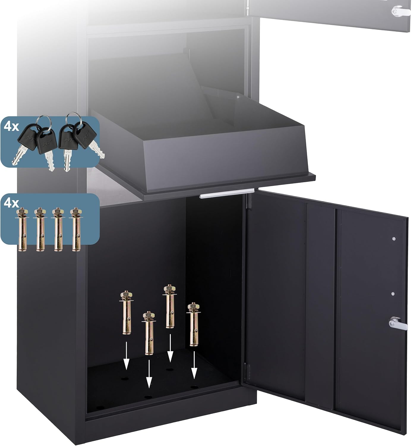 This elegant letterbox with parcel compartment ensures a safe and comfortable reception of your mail and parcels. Thanks to the 2 separate compartments, you can easily receive letters, newspapers and parcels in your absence. Thanks to the drop-in flap, access to the packages is no longer possible from the outside. The lockable compartments guarantee that only authorized persons can remove the contents from the mailbox. In addition, the parcel box impresses with its modern design. Letter box with parcel compartment in detail. Dimensions H x W x D: approx. 112 x 50 x 37 cm. Inner dimensions (H x W x D): approx. 66 x 49.5 x 36.5 cm. Material: powder-coated iron, stainless steel. Various colours. Post box for letters and packages. Safe reception of parcels and letters even when you are away. 2 separate compartments for practical, contactless delivery. With flap for parcels as theft protection. Lockable with 4 keys. Weatherproof construction reliably protects against rain and sun. modern design from Iron and silver accents made of stainless steel. Includes mounting material for stable attachment to the floor. Box contents: 1 x letterbox, 4 x keys, with instructions (English language not guaranteed), with mounting material, decorative items are not included