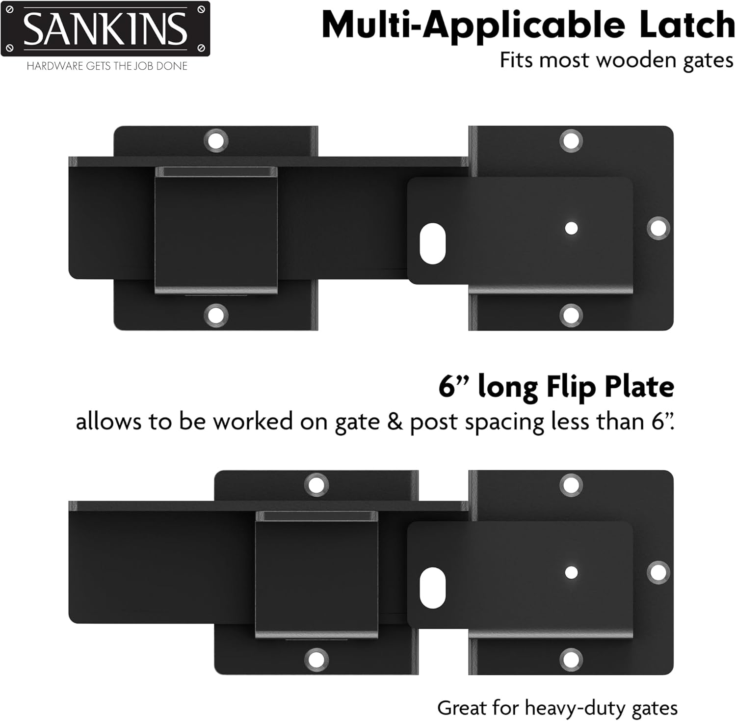 Product Description SANKINS Flip Gate Latch with Padlock Hole, Heavy Duty Adjustable Safety Door Latch for Sliding and Swing Open Door, Outdoor Fence, Barn Door, Shed Door, Garage, Yard, Matte Black Package Includes: 2x Gate Latch 2x Latch Latch Receiver 20x Mounting Screw Material: iron Color: matte black Multipurpose: The flip gate latch with padlock hole is both a latch and a lock. Suitable for sliding and swing open door, double door, outdoor gate, wooden fence, barn door, shed, garage, yard, driveway, garden, horse stall, patio, balcony. Features: The flip gate latch is made from high quality iron, strong, and durable. It can be used for a long time even in bad weather. The gate latch surface is smooth, waterproof, no rust. The flip gate latch has a maximum rotation angle of 180 degrees, allowing you to install the latch on the left or right side of the door.
