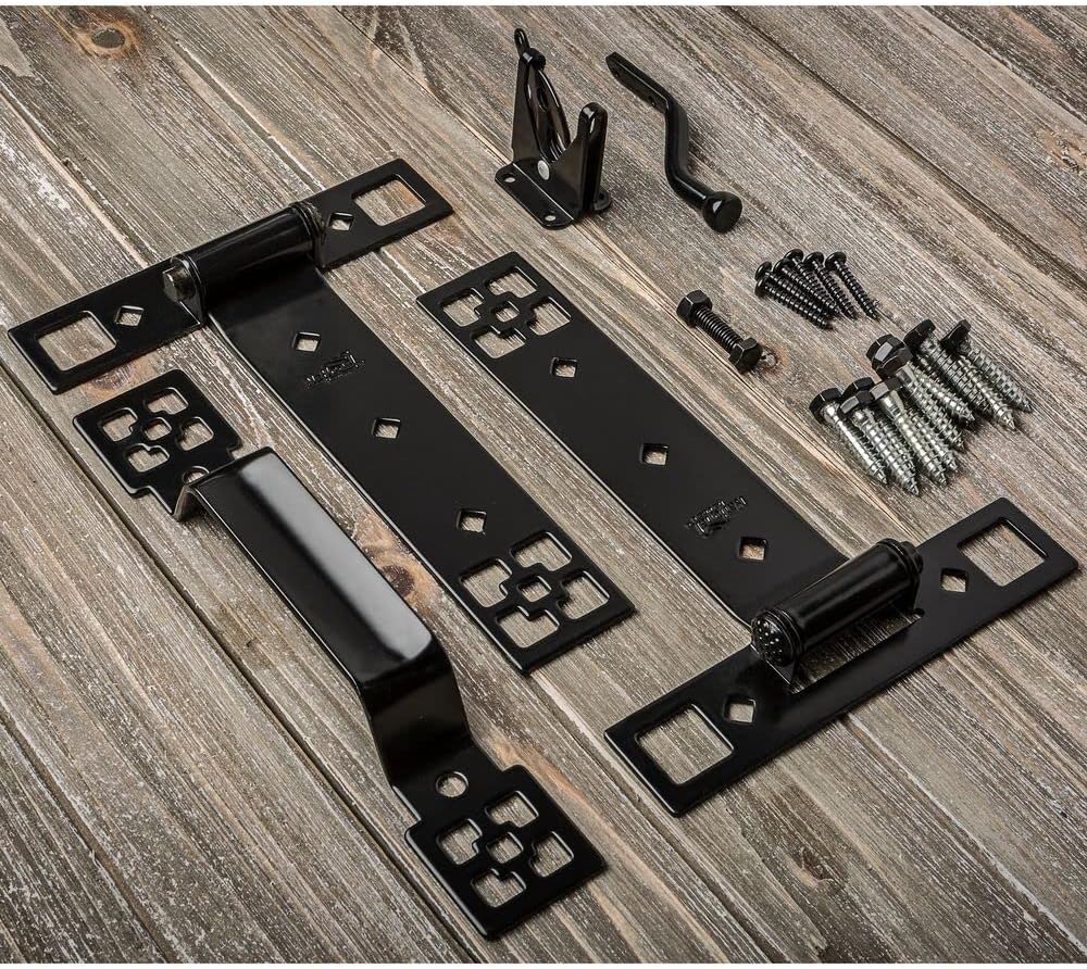 Kit includes: 1 gate latch, 2 T-hinges, 1 pull, and mounting fasteners. Craftsman designed gate kit for gates, sheds, and outdoor doors. Includes self latching latch that works with National Hardware Cable pull N109-070. Includes two durable hinges for a stylish and durable gate. Gate latch can be padlocked.