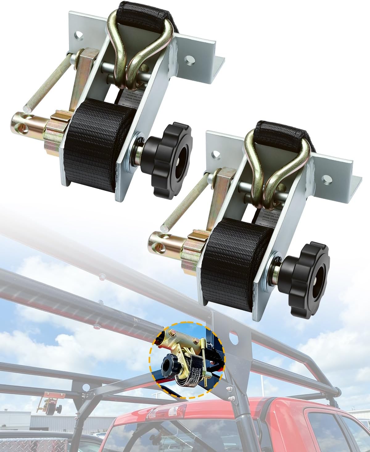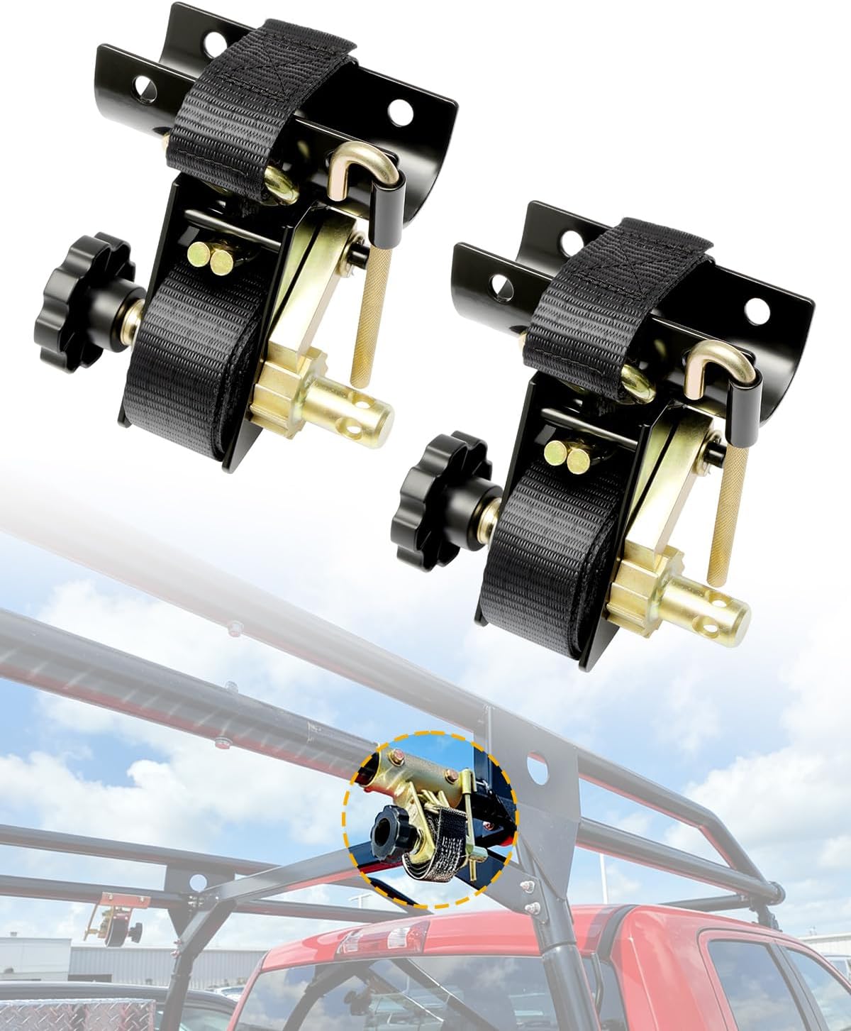 Packing List:4x Retractable Ratchet Tie Down Straps with J Hooks-Black Bracket & Black Strap4x Diameter Rod40x Bolt Mounting HardwareBREAKING STRENGTH: 1500 lbs || WORKING LOAD LIMIT: 500 lbsCondition: NewWork with:Our ratchet straps heavy duty are designed to provide humanity with cargo securement made efficient, simple, safe and effective. Adds convenient, permanent securing points to a ladder rack with round tubing. Our heavy duty 1.5 inch ratchet straps with j hooks are compatible with a wide range of cargo, including vehicles, furniture, appliances, and more. They can also be used on trailers, pickup trucks, and other types of transportation. They may not chain down a bridge, but they are THE STRONG SOLUTION for trailering your motorcycles and 4-wheelers, anchoring down furniture in your truck bed, securing mobility scooters to hitch trailers, tying down lawn equipment in a utility trailer.When attached to cargo rack simply unhook strap while unraveling enough to fit around desired item, hook onto one of two built-in attachment points, and take up slack with the large easy-twist knob.Tie down features 3 ways to tighten load using diameter rod, wrench, or drive socket wrench (tools not included).