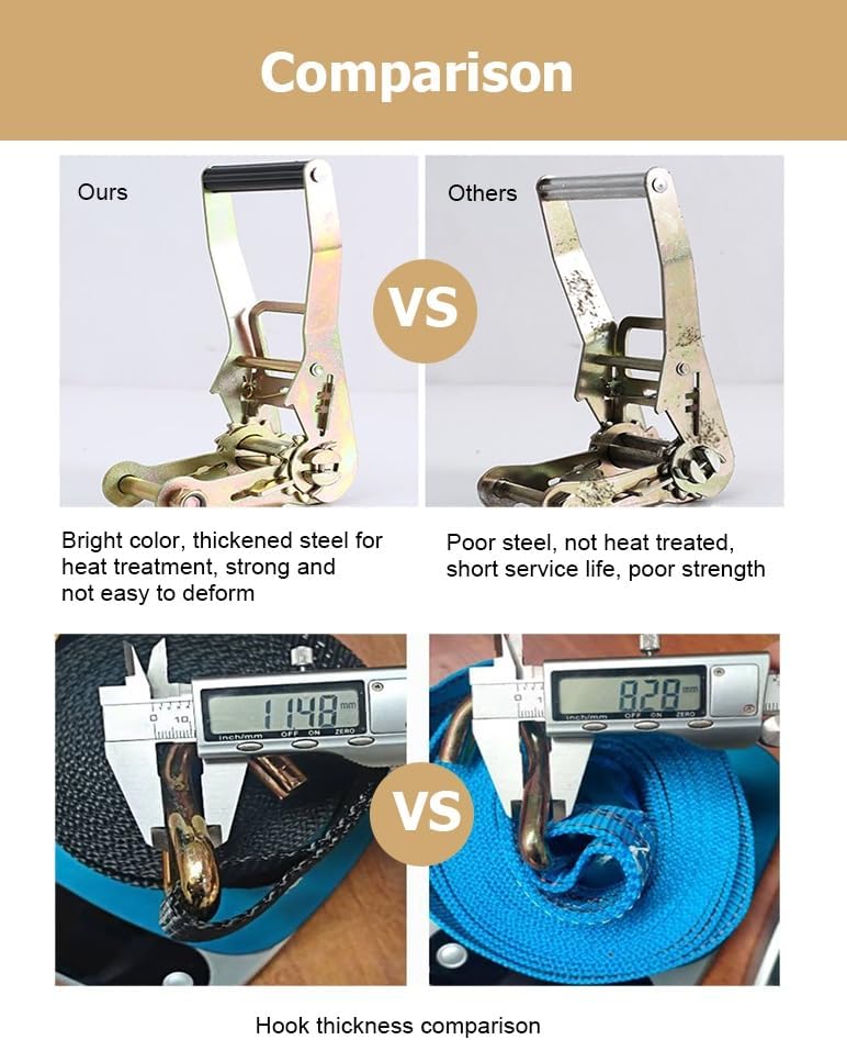 Are you still worried about cargo falling off easily?Heavy duty ratchet straps with steel hooks, tie down straps can be widely used to secure cargo for moving and securing equipment, motorcycles, trucks, vans, kayaks, warehouses, etc.Specifications: Name: Polyester Tie Down StrapsColor: Black , BeigeMaterial: Polyester Straps + Steel Frame + Aluminum HandleWidth: 5 cm / 2 inLength: 3.0 m / 9.8 Ft , 4.0 m / 13.1 Ft , 5.0 m / 16.4 Ft , 6.0 m / 19.7 Ft , 8.0 m / 26.2 Ft , 10.0 m / 32.8 Ft , 12.0 m / 39.4 Ft , 15.0 m / 49.2 FtApplication: Bundling goods /fixing goods, etc.Features:1. High-density cargo straps are wear-resistant and break-resistant2. Cargo straps are easy to use, not easy to fall off and can be fixed immediately3. Truck straps have an easy-release mechanism to easily release the tension on the straps4. Ratchet straps have double-stitched edges to prevent slipping during use; ensure that the cargo is firmly fixed in place, giving you peace of mind when transporting cargo; reinforced stitching adds extra strength and stability to the straps5. Lashing strap are equipped with double J-hooks for easy fixation6. Tow strap have strong pulling force, 5tons/11023lbs7. Tie down straps are widely used, including moving, securing cargo, camping or other tie-down needs, such as warehouses, motorcycles, canoes, kayaks, ATVs, trucks, boxes, furniture, lawn equipment, etcPackage Included:4 x Heavy Duty Ratchet Strap with HookTighten Ratchet Straps Steps:1. Pass the strap under the tensioner rotating shaft2. Pass the strap through the center slot of the tensioner rotating shaft3. Pull the tensioner handle back and forthRelease Ratchet Straps Steps:1. Fasten the safety plate outwards2. Open the tensioner to level3. Pull out the strapNotes:1. Due to manual measurement, there may be a 1-2 cm error, please u