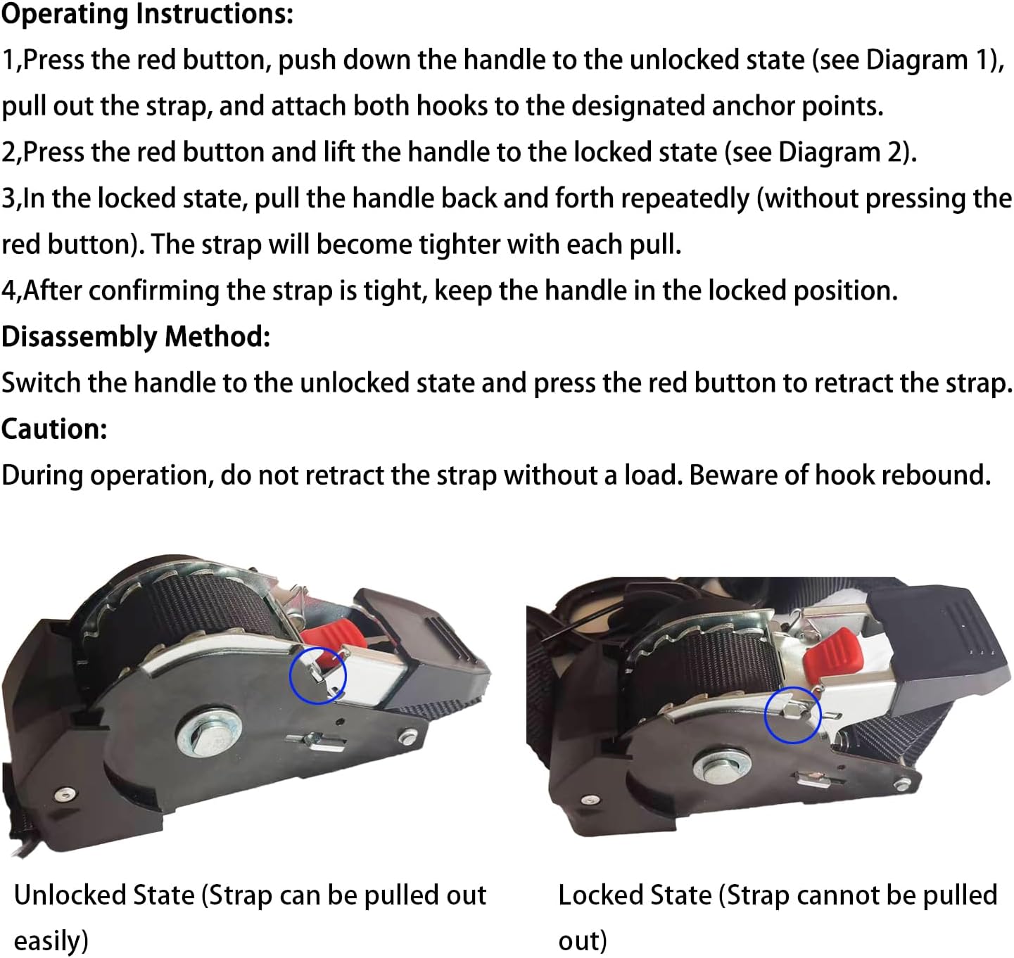 The Next Generation of Tie-Downs is Here. Secure in Seconds, Confident for Miles.Stop wrestling with traditional ratchets. We've reinvented the tie-down for unparalleled speed, safety, and simplicity. Our Auto-Retract system with self-locking hooks does the work for you.Engineered for Modern Hauling:All-in-One Automatic System: The core innovation. The strap automatically retracts and locks tight with a simple press of the lever. No more pulling, threading, or handling loose straps.Foolproof Locking Hooks: The double hooks feature an integrated spring-loaded lock. They automatically engage when attached to an anchor point, preventing them from bouncing off during transit.Durable by Design: Constructed from the same heavy-duty materials trusted by professionals—weather-resistant polyester and zinc-plated steel—ensuring long-term performance.Effortless Operation: Simply pull the strap to the desired length, press the ratchet lever down until tight, and you're done. Releasing is just a button press away.Technical Specifications:Break Strength: 800 daNSize: 25mm W x 3m LModel Type: Auto-Retract Ratchet with Self-Locking Double HooksMaterial: High-Tensile Polyester Webbing, Zinc-Plated Steel Ratchet & HooksIncludes: 4 Auto-Retract Tie-Down StrapsIdeal For: Daily drivers Long-haul trucking Motorcycle & ATV enthusiasts Landscape & construction crews Anyone who values time and safety.