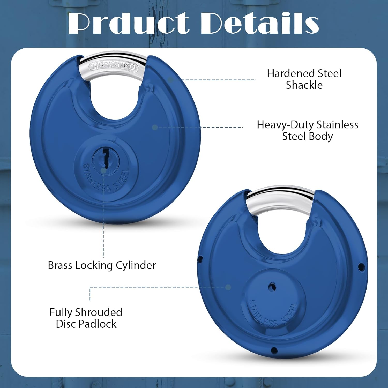 Feature: Keep your valuables safe: Stainless steel disc lock body and hardened steel shackle for maximum corrosion protection during outdoor or indoor use, weatherproof padlocks, sturdy structure, minimizes shackle exposure, and protects against bolt cutter attacks. Multiple uses: This keyed different disc padlock is Ideal for storage units, garages, sheds, trailers, mobile trucks, outdoor gates, warehouses, logistics, doors, storage, moving trucks, etc. Specifications: Color: blue Lock body material: stainless steel Shackle material: hardened steel Lock core: pure copper Size: Body wide: 2-3/4 inches Shackle Diameter: 3/8 inches Package include: 16 x Disc Padlock 32 x Keys Warm notes: Manual measurement, please allow slight errors on size. The color may exist a slight difference due to different screen displays. Please make sure that the shackle size of the product meets your requirements before purchasing