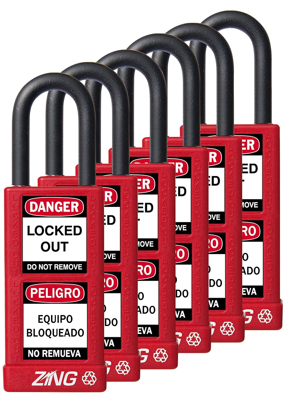 The Zing RecycLock lockout/tagout padlock, made from 70% recycled materials, has a solid aluminum body and steel shackle covered with plastic for corrosion resistance; retains its key until locked to ensure it is not left unlocked; and has a keyed alike 6-pin tumbler cylinder for security with single key convenience for use with multiple locks. This padlock has a 3" body length that provides room for bilingual labels. Includes two bilingual "DANGER: Locked Out Do Not Remove" labels, one in English and Spanish, and one in English and French. This padlock is part of a lockout/tagout (LOTO) safety procedure required at facilities where a device or energy source needs to be isolated during maintenance and repair. Specifications Lock body dimensions 3 x 1-1/2 x 3/4 inches (H x W x D) Weight 0.4 lb. Vertical shackle clearance 1-1/2" Shackle diameter 1/4" H is height, the vertical distance from the lowest to highest point; W is width, the horizontal distance from left to right; D is depth, the horizontal distance from front to back. Vertical shackle clearance is the distance from the top of the lock body to the farthest point on the inside of the shackle. Lockout/tagout (LOTO) safety procedures require that lockout devices meet Occupational Safety and Health Administration (OSHA) 1910.147(c)(5) standards for quality assurance. Safety padlocks, also called lockout padlocks, use colors or warning labels to help prevent machine operation or power activation during maintenance and repair. The security level of a safety padlock is measured more by the number of key codes (also called key changes or key cuts) it can offer than by its ability to withstand physical abuse. A padlock with more pin tumblers and higher precision key cylinders has more key codes available, making it harder to pick, and less likely for a large facility to inadvertently give two employees padlocks with the same key code. Keyed alike locks allow one user to open many padlocks with one key. Keyed different means each lock is opened by its own key. Master keyed locks can be opened if the original key is lost or unavailable during an emergency. Zing Green Products manufactures environmental signs and safety equipment from recycled materials. The company, founded in 2007, is headquartered in Oswego, IL. What's in the Box? RecycLock safety padlock Key Bilingual "DANGER: Locked Out Do Not Remove" labels in English/Spanish and English/French (quantity: 2)