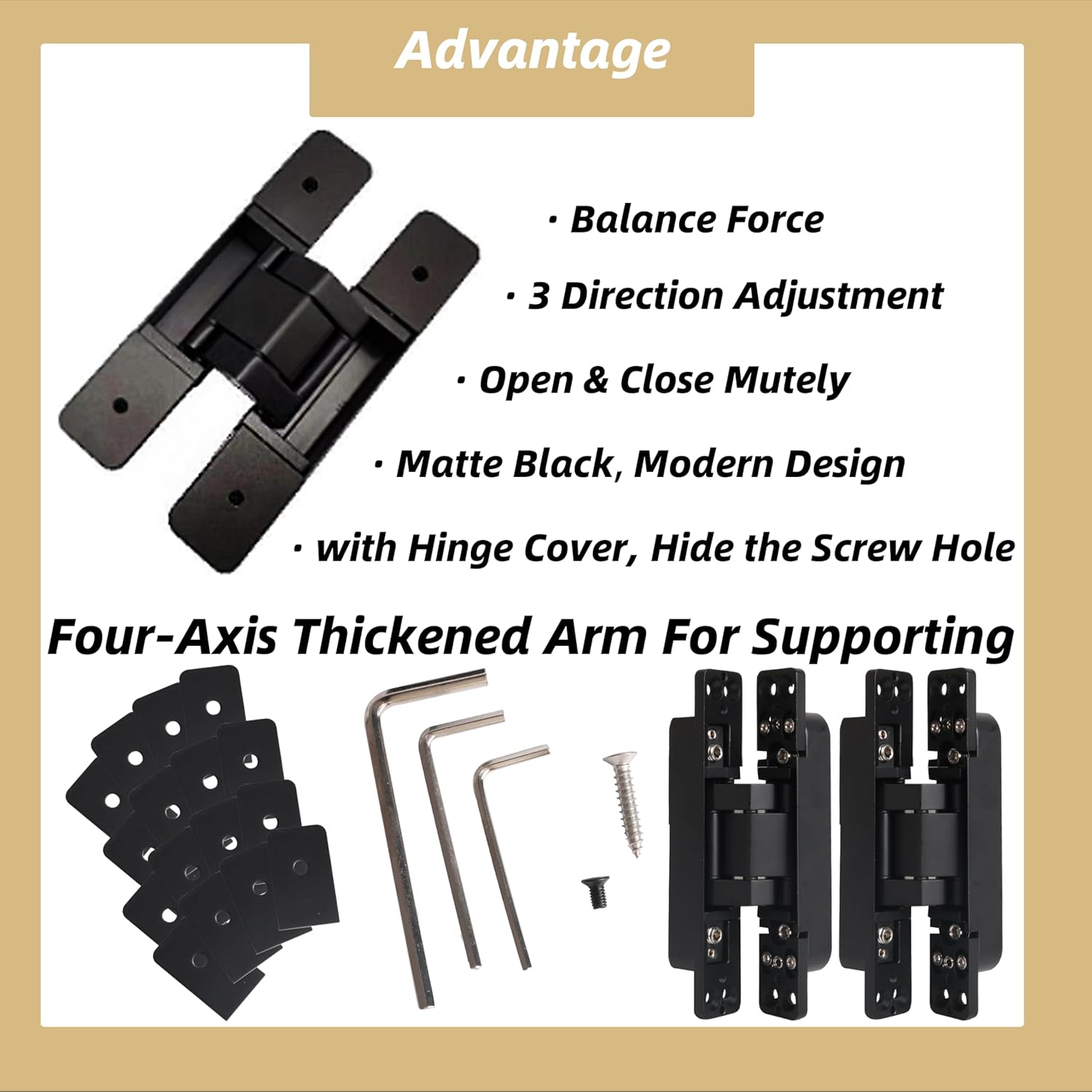 | Included Components | 4 * 180 Degree Opening Concealed Door Hinges;16 * Flat head screw;32 * Self-tapping screw;3 * Adjustable wrench;16 * Hinge Cover |