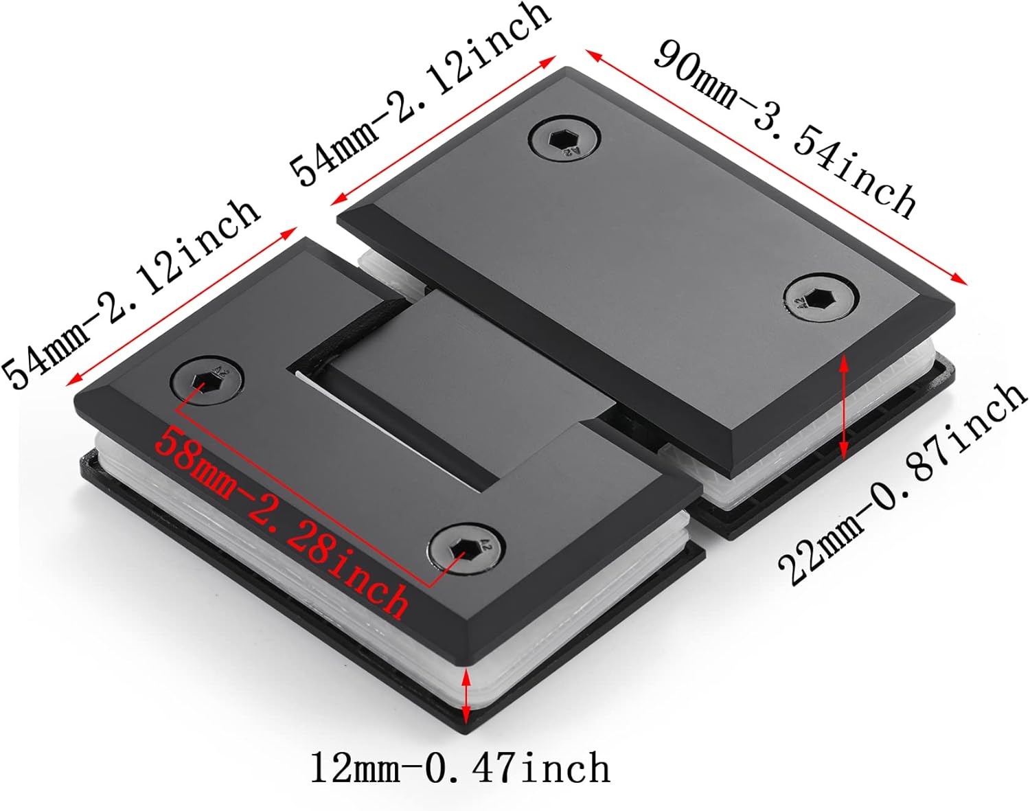 This bathroom hinge is made of high-quality 304 stainless steel, offering excellent corrosion and rust resistance. 304 stainless steel maintains its gloss over time and is highly durable in humid bathroom environments, resisting corrosion, discoloration, and rust spots to keep the hinge stable and aesthetically pleasing. Additionally, the hinge uses a one-piece precision casting process. The integrated design not only strengthens the product structure, providing enhanced support, but also effectively prevents loosening and wear issues common in traditional joint designs, ensuring long-term stability and smooth operation of the glass door. Precise Dimensions and Complete Accessories: making it compact and robust, suitable for various frameless glass doors. The product comes with a full set of installation accessories, including 1 hinge, 1 adjustment tool, 4 screws, 2 rubber sleeves, 4 washers, and 4 decorative covers, ensuring a secure and aesthetic installation while sparing users from the hassle of purchasing additional items. These accessories further enhance the product's versatility and ease of installation. Applicable Door Thickness and Load Capacity: This hinge is specially designed for heavy glass doors, compatible with glass doors 5/16" to 1/2" (8mm, 10mm, and 12mm) thick, with each hinge supporting up to 50 lbs. This high load-bearing capacity guarantees the safety and stability of the glass door, making it suitable for large and heavy frameless glass doors, providing a worry-free user experience. Installation Requirements: This hinge requires holes to be drilled in the glass for secure attachment to ensure close fitting between the hinge and the glass. Refer to the included dimension diagram for exact hole measurements. It is recommended to have professional installation to achieve optimal stability and durability. Once installed, the hinge fits seamlessly with the glass door, creating a smooth, unified door structure that enhances the user experience. Stylish Electroplated Black Finish: Adds a modern and sophisticated touch to the bathroom, with excellent corrosion and rust resistance for long-term use in humid environments. The electroplated black finish not only looks elegant but also enhances surface durability, ensuring the hinge retains its lasting shine with frequent use. Multi-Functional Application Scenarios: This bathroom hinge is suitable for a wide range of applications, such as home bathrooms, hotel shower rooms, saunas, steam rooms, gym locker rooms, and upscale commercial restrooms. Its modern appearance adds a stylish touch to any space, while its one-piece stainless steel structure provides enhanced durability and stability. Whether for home or commercial projects, this hinge meets high standards, making the space more modern and functional.