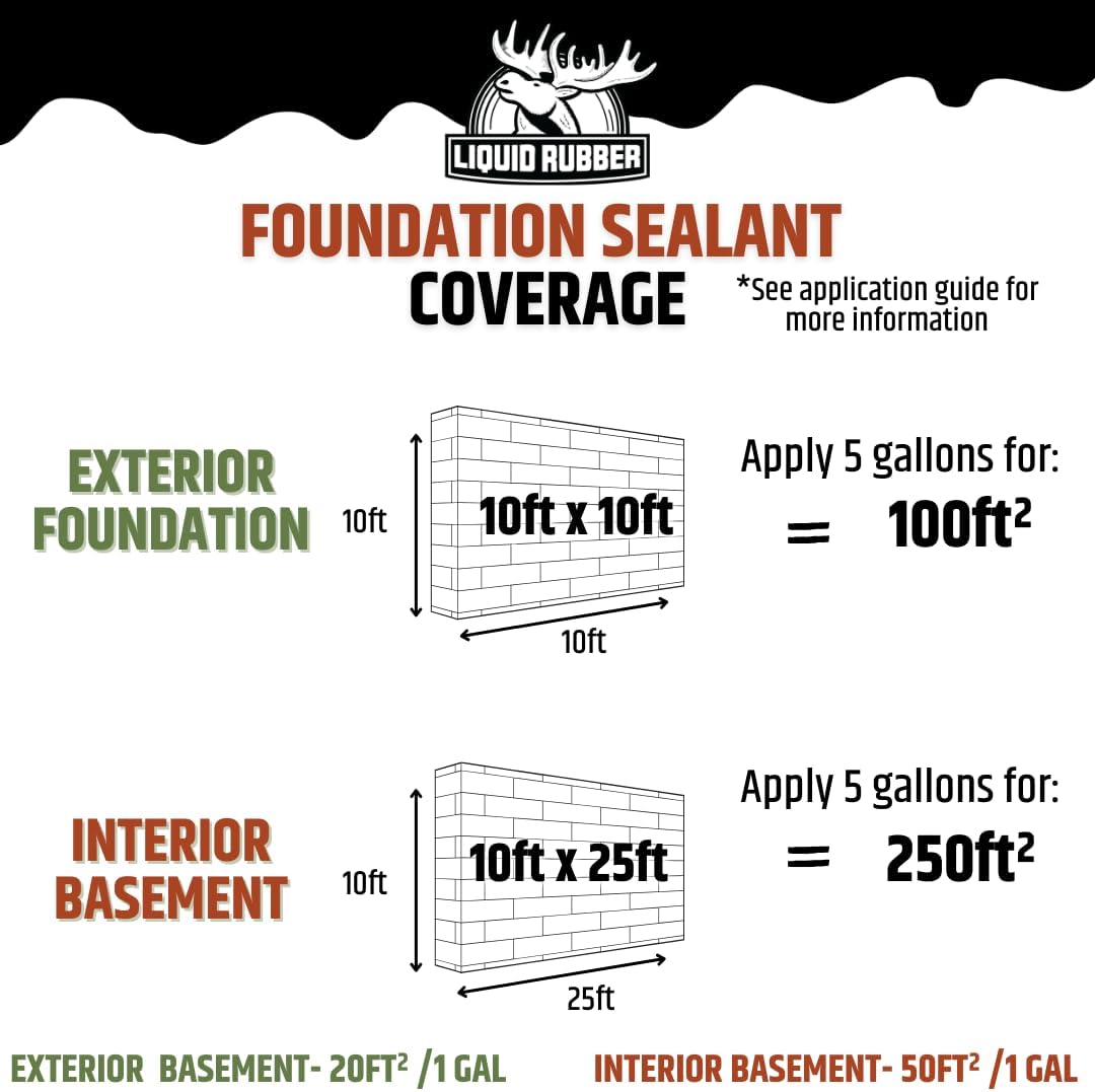 Easily complete your basement waterproofing, foundation leak repair, shower liners, and planter boxes projects with our professional-grade flexible sealant and liquid rubber technology. This advanced formula creates a permanent foundation waterproofing membrane engineered for protection. Perfect for concrete crack filler, concrete sealer, and basement foundation repair, our basement waterproofing system delivers professional results for DIY and contractor use. The waterproof paint and foundation sealer system combined with our seam tape and adhesive and sealant caulk offer superior protection. When ordinary rubber sealant, concrete paint, rubberized paint, or rubber waterproofing won't suffice, our advanced coating excels on concrete, masonry, foundations, and basement surfaces. This waterproofing membrane system integrates with your foundation leak repair strategy. Compatible with other waterproofing systems, while providing superior adhesion and flexibility. Use for house foundation repair projects or targeted basement repairs.. Application: Prepare surface by ensuring it's clean, dry, and structurally sound. Apply 2-3 coats for interior basement (50 sq ft/gallon) or 3-4 coats for exterior applications (20 sq ft/gallon). Maintain 50°F-90°F. Allow 4-6 hours between coats. For optimal results in foundation crack repair, basement waterproofing, shower liners, and planter boxes, use seam tape at joints. Our water-based, zero-VOC foundation sealer formula requires no mixing and stores well when sealed and above freezing. Tips: Apply heavy, consistent coats using brush, roller, or sprayer. Remove painter's tape while wet. When used as part of a concrete sealant system, ensure proper preparation and drainage. For DIY, work in manageable sections. Contractors can achieve optimal coverage using airless sprayer for large-scale projects.