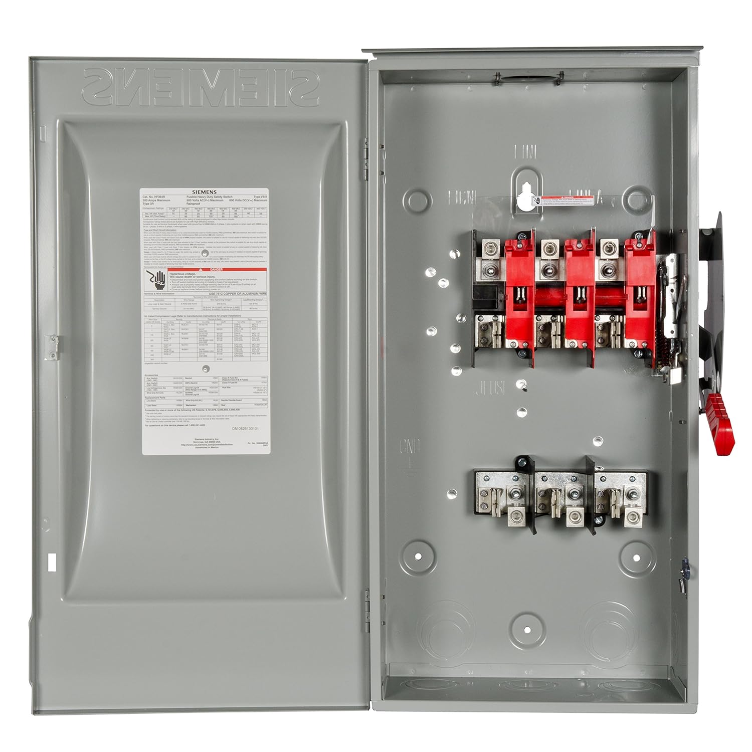 Siemens heavy duty safety switches are available in 30-1200A ratings and in Type 1, 3R, 12 and 4X enclosures. Both fusible and non-fusible versions are offered. They can be used on circuits that are rated through 200K when protected by or used with Class R or J fuses. They feature quick make and break operation and visible blade construction.