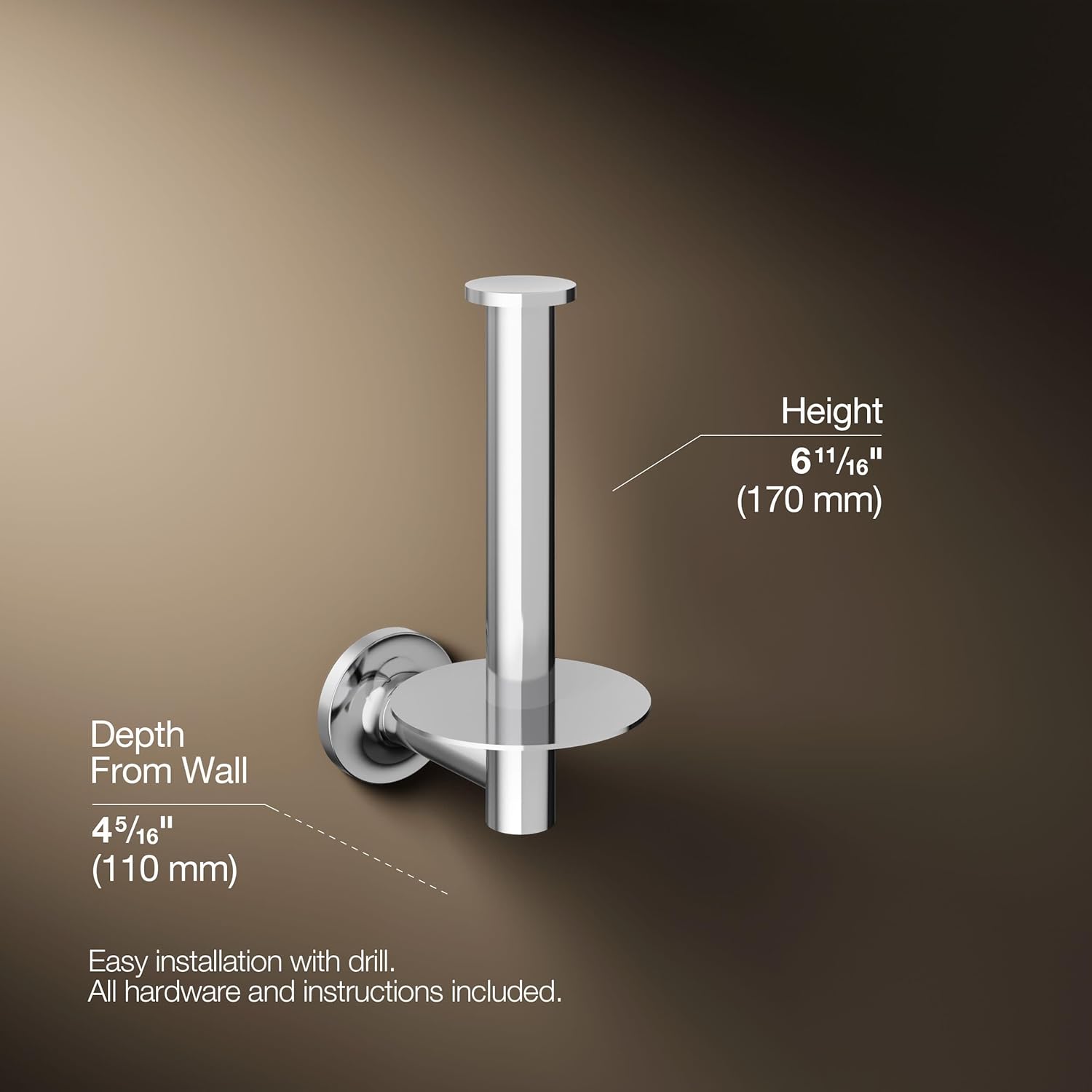 Product Description The minimalist design of KOHLER Purist faucets and accessories complements both traditional and contemporary bath decors. This toilet paper holder showcases a unique vertical style that echoes the elegant simplicity of the Purist collection. At Kohler, we make it our business to help you create the bathroom space of your dreams. Amazon.com Purist faucets and accessories combine simple, architectural forms with sensual design lines. This Purist toilet tissue holder is both sculptural and highly functional. Available in durable, lustrous finish choices, including Vibrant PVD color finishes, the Purist toilet tissue holder reliably withstands the demands of daily use while providing design continuity. Featuring careful detailing and a minimalist aesthetic, this toilet tissue holder coordinates perfectly with the Purist Suite of fixtures, faucets and other accessories to create a serene and soothing environment. The clean, sleek style of each piece is mirrored in the Purist Suite, delivering a calming force in any contemporary bath or powder room. In the tradition of classic modernity, Purist faucets and accessories offer visual interest without adding clutter.KOHLER Bathroom Faucets and Accessories Expectations have changed for todays bathrooms. But whether youre creating a serene, spa-like environment in the master bath or breathing new life and character into a powder room, KOHLER® bathroom faucets and accessories provide inspiration and lasting performance. Crafted from premium quality materials, our faucets and accessories are available in a wide array of colors and finishes, including Vibrant® PVD color finishes that are remarkably resistant to staining, corrosion and tarnish. Our ceramic disc valves are tested for 500,000 on/off cycles twice the industry standard to deliver reliability and long life. Additionally, Rite-Temp® showering technology ensures water temperatures do not fluctuate. KOHLER bathroom faucets and accessories embody innovative excellence from fresh twists on vintage styling to pioneering the use of different materials. And "No Sweat" installation with flexible water supplies and pre-assembled valves saves you time, effort and money. With design themes ranging from classic to contemporary and our tradition of meticulous craftsmanship, KOHLER bathroom faucets and accessories allow you to express your personal sense of style with confidence. All KOHLER faucets carry a lifetime limited warranty for as long as the original consumer/purchaser owns his or her home.KOHLER Suites and Ensembles Always a leader in innovative design, Kohler pioneered the concept of creating families of plumbing fixtures, faucets and accessories featuring like design elements that resonate among the pieces. Today these families have evolved into our distinct, stylish bathroom suites and ensembles. Each unique KOHLER suite brings together a matching bath, lavatory and toilet, as well as faucets and accessories, for a complete design solution. Our ensembles are comprised of a coordinated lavatory and toilet with integrated styling to perfectly suit a powder room or complement a bath or whirlpool when furnishing a full-sized bathroom. Various suites also offer corresponding tabletops, cabinets and bathroom furniture to provide a one-stop shopping experience. A wide array of sizes, shapes and KOHLER colors and finishes is available to accommodate personal preferences and particular space configurations. KOHLER suites and ensembles simplify the process of achieving a unified look that reflects your individual style. Our Purist Suite, with its serene sophistication, transforms the bathroom into a home spa. Its fixtures, laminar faucets capture the language, the feeling, the art of water. Classic materials balance the unexpected to compose evocative, changeable forms a quiet backdrop for the poetic simplicity of water.About Kohler Co. Founded in 1873 and headquartered in Kohler, Wisconsin, Kohler Co. is one of Americas oldest and largest privately held companies. Kohler is a global leader in the manufacture of kitchen and bath products, engines and power generation systems, cabinetry, tile and luxury home furnishings, and international host to award-winning hospitality and world-class golf destinations. Kohler Co. is known around the world for plumbing products, its traditional core business, and its flagship brand: KOHLER.