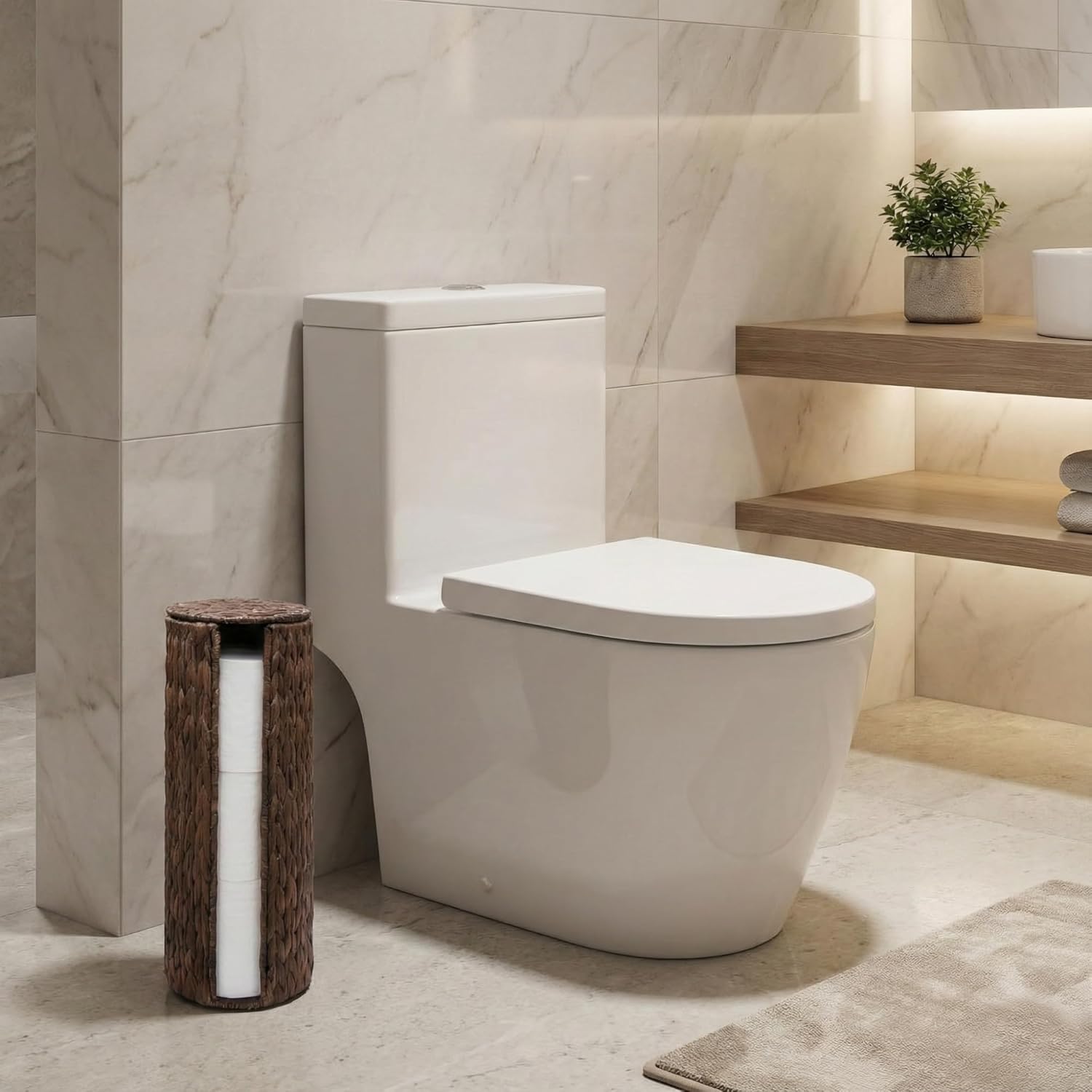 "PINXIURY Water Hyacinth Toilet Paper Holder Stand, a graceful fusion of practicality and rustic charm for your bathroom sanctuary. Crafted to effortlessly accommodate up to three rolls of toilet tissue, this holder not only provides essential storage but also elevates the aesthetic appeal of your space with its artisanal craftsmanship. Handwoven from natural water hyacinth, each piece exudes a unique warmth and texture, infusing your bathroom decor with a touch of organic elegance. Elevated by delicately raised feet, this stand ensures your toilet paper stays clear of the floor, preserving its cleanliness and dryness. Bid farewell to damp rolls and welcome a more hygienic bathroom experience, all while adding a quaint farmhouse-inspired accent to your powder room or under-sink area. A thoughtful addition, the flip-top lid serves as a shield against dust and debris, preserving the pristine condition of your toilet paper. Individually handcrafted, each holder possesses a subtle variation in size, adding a bespoke charm to your space. Whether nestled in the main bathroom, guest powder room, or tucked away under the sink, this toilet paper holder stand seamlessly integrates into any corner, providing convenient access to your bathroom essentials. Elevate your bathroom storage with the PINXIURY Water Hyacinth Toilet Paper Holder Stand — Transform your space, where every detail reflects your commitment to beauty, functionality, and mindful living.