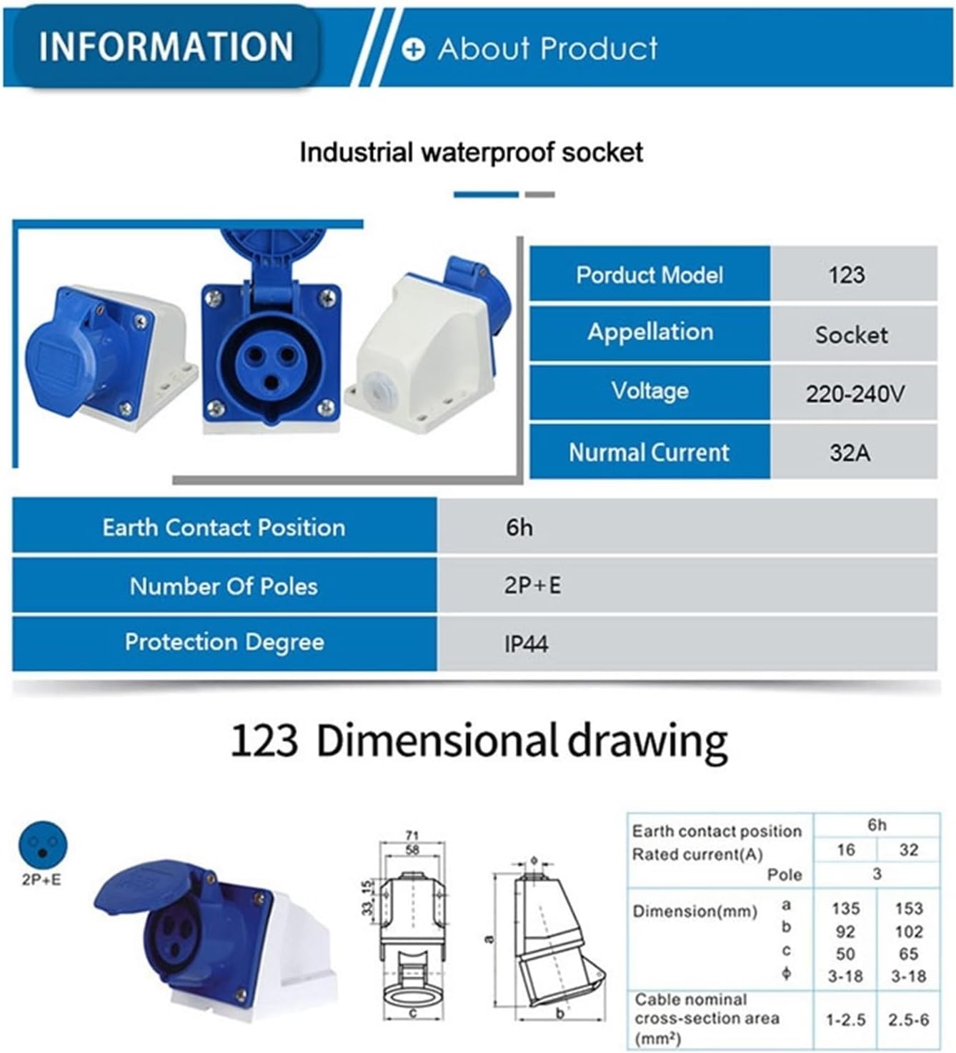 Electrical Connectors1PCS 32A 3Pin 2P+E Electrical Wire Cable Outdoor Waterproof Connector Industrial & Sockets 220V-240V IP44 Junction Box==========Model Number : 023/123/223/323Voltage : 220 V