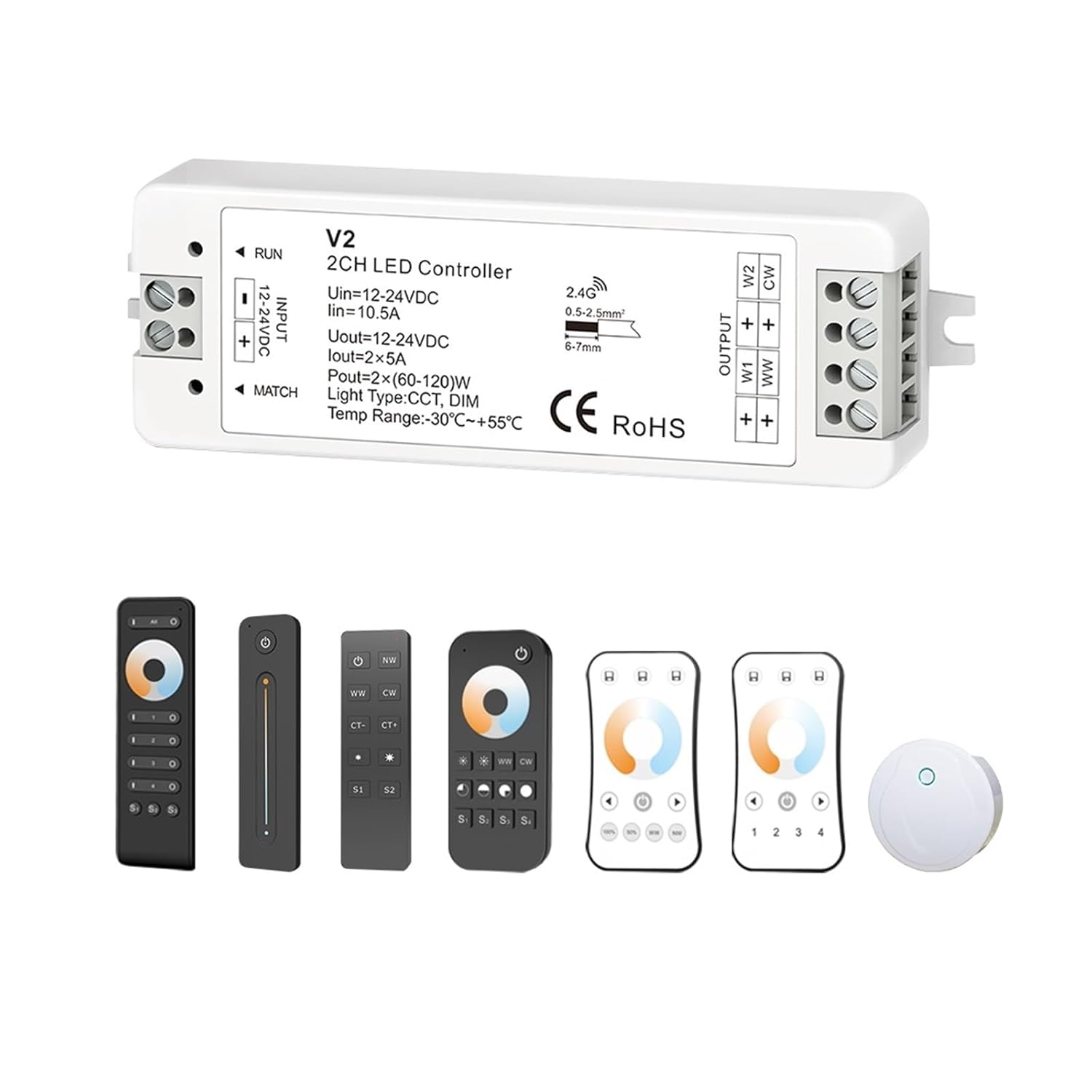 Low Voltage TransformersWW CW LED Controller 12V 24V 10A 2CH 2.4G Monochrome CCT Light Bar LED Dimming Controller Remote Control with Bracket V22 channels/stepless dimming/wireless remote control/automatic transmission/synchronizationfeature: controller with 2-channel PWM constant voltage output,The default is a two-color (WW/CW) controller, which needs to be paired with a two-color remote control.It can also be used as a single dimming controller with strong compatibility.Dimming and switching are smooth and flicker-free.Fully compatible with various single-color and dual-color remote controls.Using 2.4GHz technology, the remote control distance can reach 30m.One receiver can accept up to 10 remote controls.controller.Combined with a power amplifier, the output can be infinitely expanded.Technical Parameters:Input voltage: 12-24V DCInput current: 10AOutput voltage: 12-24VDCOutput current: 2CH, 5A/CHOutput power: 120W/240W (12V/24V)Output type: constant voltageInput signal: 2.4GHzControl distance: 30MDimming level: 4096 levelsDimming range: 0 -100%Dimming curve: linearPWM frequency: 2KHz (default)Specification:Product name: 2.4G radio frequency two-color LED controllerModel A: LSD-V2+R12; Model B: LSD-V2+R2; Model C: LSD-V2+R7-1; Model D: LSD-V2+RT2; Model E: LSD-V2+R7; Model F: LSD-V2+RS2; G type: LSD-V2+ relayInput: DC 12V 24VWorking temperature: -20-60℃Maximum load current: 2CH, 5A/CHMaximum output power: 12V maximum 120W, 24V maximum 240W. remote control frequency: 2.4G MHz remote control distance: 30MCompetition Guide:This dimmer can be matched with various single-zone or multi-zone 2.4G dimming remote controls.Option 1: Use match keys1. Matching: Short press the matching button, and within 5 seconds, press the remote control's power button.2. Delete: Press and hold the matching button for 5 seconds to delete all matching remote controls.Option 2: Use power-ups1. Pairing: Turn off the power, then turn the power back on. Quickly press the remote control switch button 3 times within 5 seconds after turning it on. The light flashes 3 times to indicate successful pairing.2. Delete: Turn off the power, then power on again. Quickly press the remote control's on/off key or zone key 5 times within 5 seconds after turning it on. The light flashes 5 times to cancel the link.