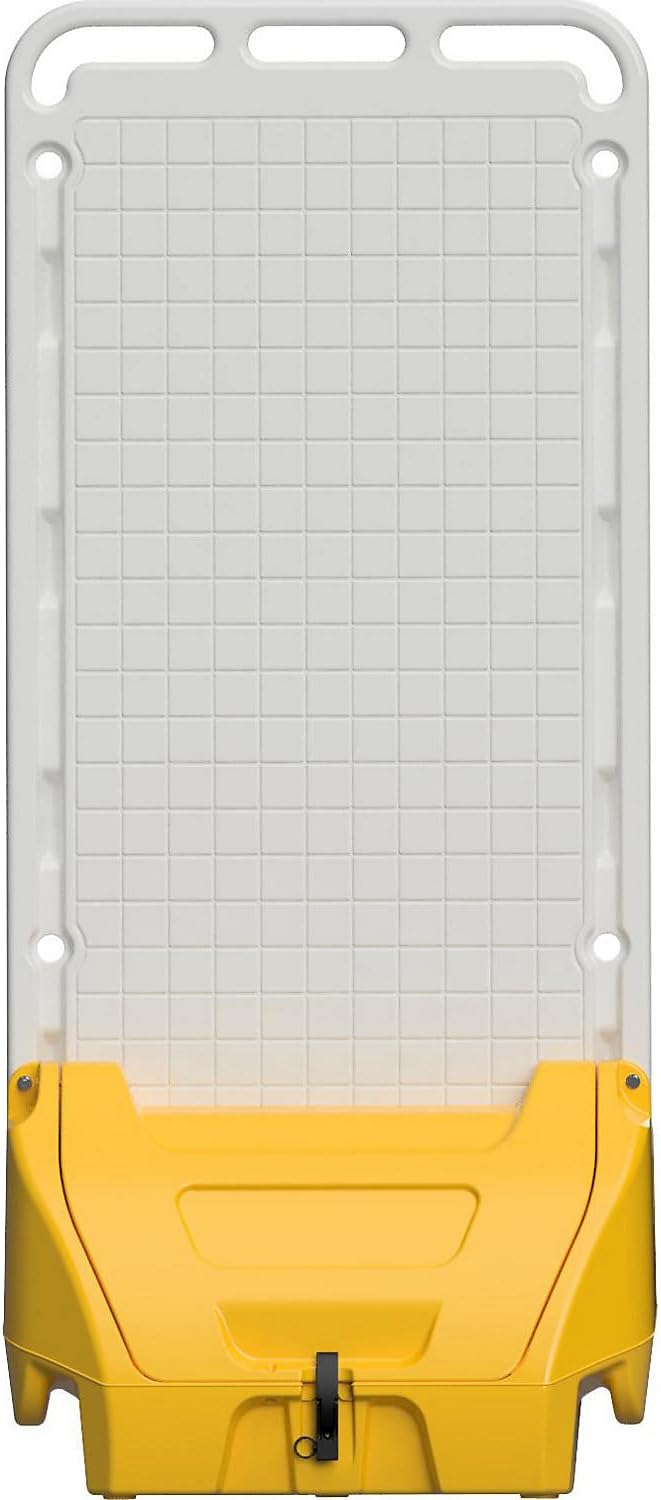 Universal partitions. For first aid or fire extinguishing products, binders, protective equipment, documents, information and commercial materials, etc. Individual fixation of products and information to the plastic panel. Consumable material can be stored in the container. Integrated wheels and ergonomic handles for easy transport. Suitable for indoor and outdoor use, made from robust polyethylene. Multi-purpose folding display stand to set up to your taste. Always where it is needed. Ideal for placing first aid or fire extinguishing products, personal protective equipment, disinfectant product dispensers, documentation boxes and even information and commercial material, etc. Consumable or ballast materials can be stored in the container. Robust polyethylene (PEMD) construction is very durable, UV-resistant and completely recyclable. Integrated rubber wheels (Ø 200 mm). Useful panel surface 1060 x 580 mm. Maximum 8 kg can be placed on each side (products, commercial materials, etc.). To fix it to the wall, use self-tapping screws. If heavy objects are to be placed, drill the wall completely. In certain circumstances it may be necessary to weight it, e.g. with sandbags (for greater stability). 3 anchor points at the bottom for fixing to the ground. Bottom access on 2 sides with common stackers. Suitable for cranes. Stackable for easy transport. Easy to clean. Easy assembly and disassembly. Container (for consumables, ballast, etc.) with lid, rubber seal and knocker lock for attaching a padlock (not included in the delivery set). For indoor and outdoor storage.