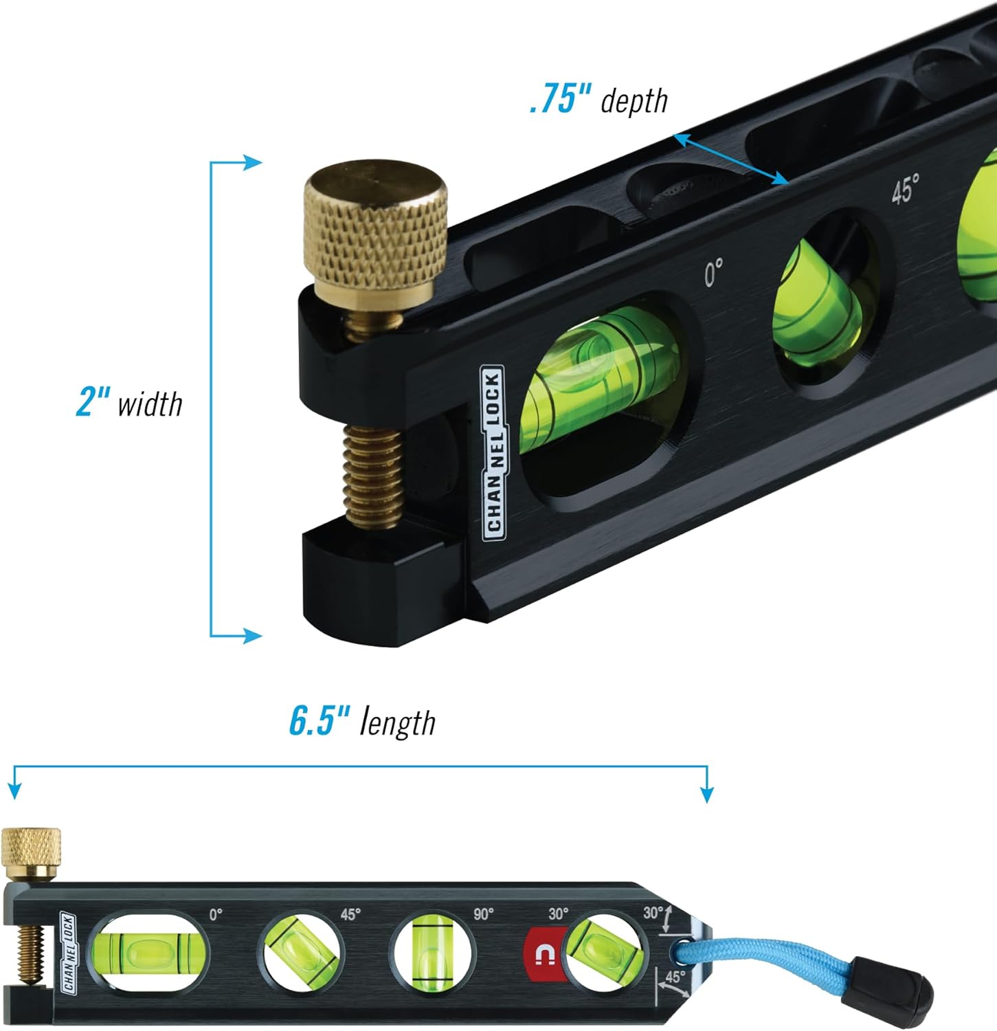 Master every measurement with the CHANNELLOCK 6.5-Inch Magnetic Billet Torpedo Level. Inspired by America's electrical pros, this billet level includes four vials that read 0°, 30°, 45°, and 90° for ultra-accurate measurements, and an integrated no-dog attachment for precise conduit bending. It also features a rugged anodized aluminum frame, a v-groove base for secure placement on pipes and conduit, and rare earth magnets to ensure a powerful hold on metal surfaces. Plus, the level's hanging strap allows for easy storage and transportation to and from the job.