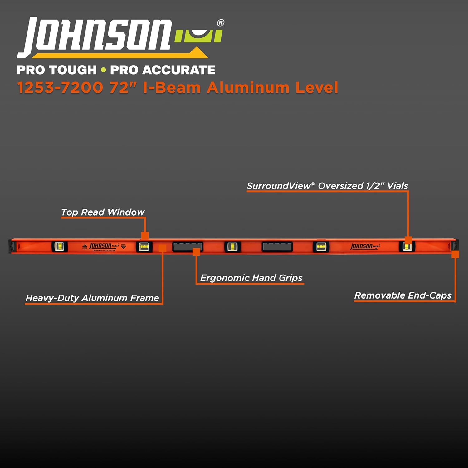 Professional finish carpenters prefer Johnson levels with removable endcaps because you can scribe a perfectly straight line directly into a corner. Historically, this feature was only found on box levels - but Johnson has raised the bar again by offering the industry's first I-beam level with a removable endcap. To make this level as easy to use as possible, the oversized 1/2" vials come equipped with Johnson's SurroundView technology for maximum visibility along with a top read window allowing the user to stand over the work to view the vials. The GripTight non-slip end caps allow you to hold the level firmly in place with just one hand, and the large comfortable rubberized hand grips provide a comfortable, sure grip every time.